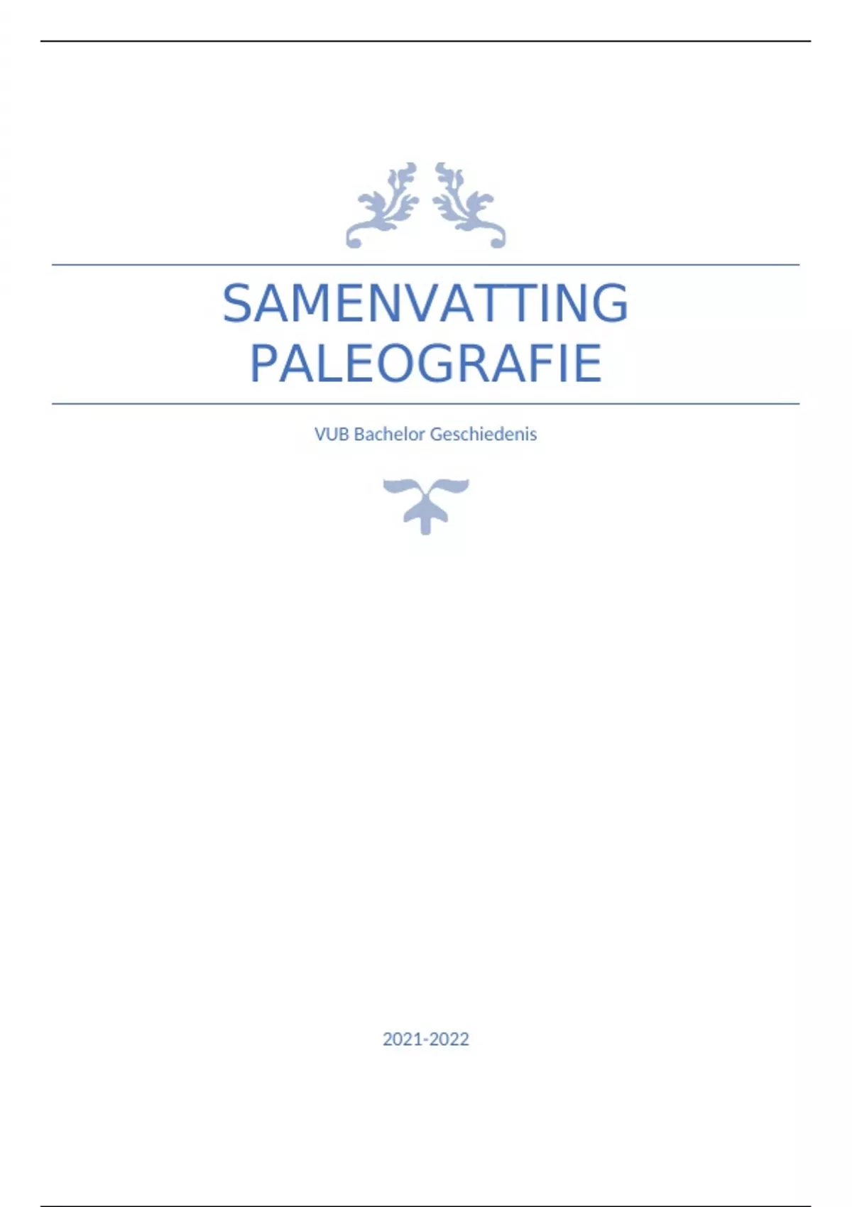 Dit is een samenvatting/quick sheet voor het open boek examen van Paleografie. Ik ben in eerste zit geslaagd met 19/20.
