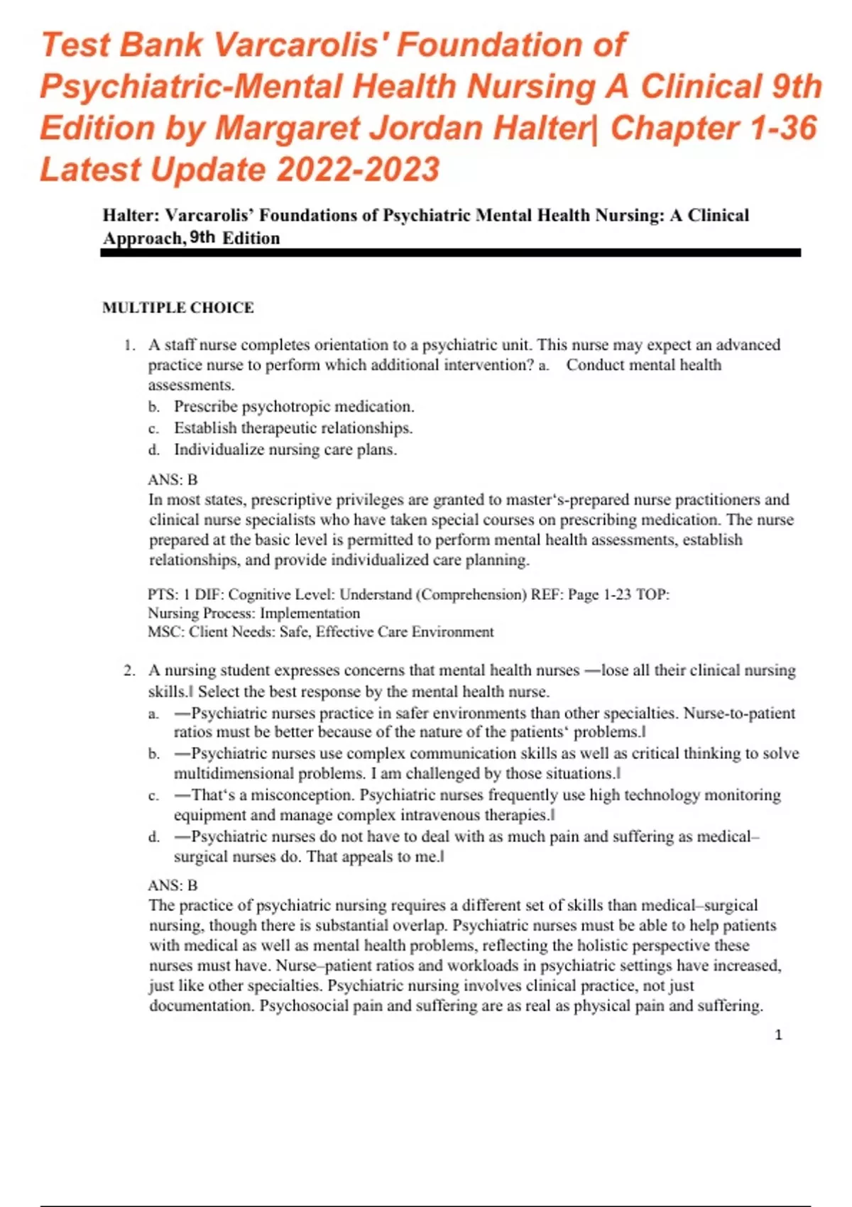 Test Bank for Varcarolis' Foundations of Psychiatric-Mental Health Nursing, 9th Edition (Margaret Jordan Halter, 2023) Chapter 1-36 | All Chapters