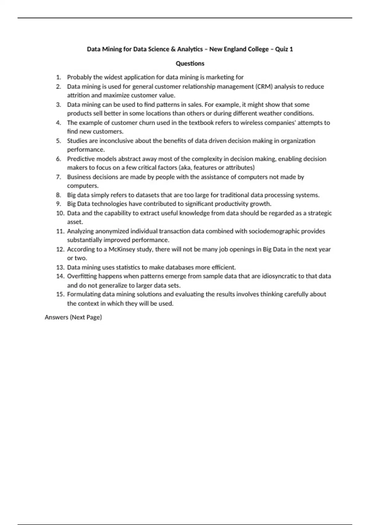 Data Mining for Data Science and Analytics - New England College - Quiz 1