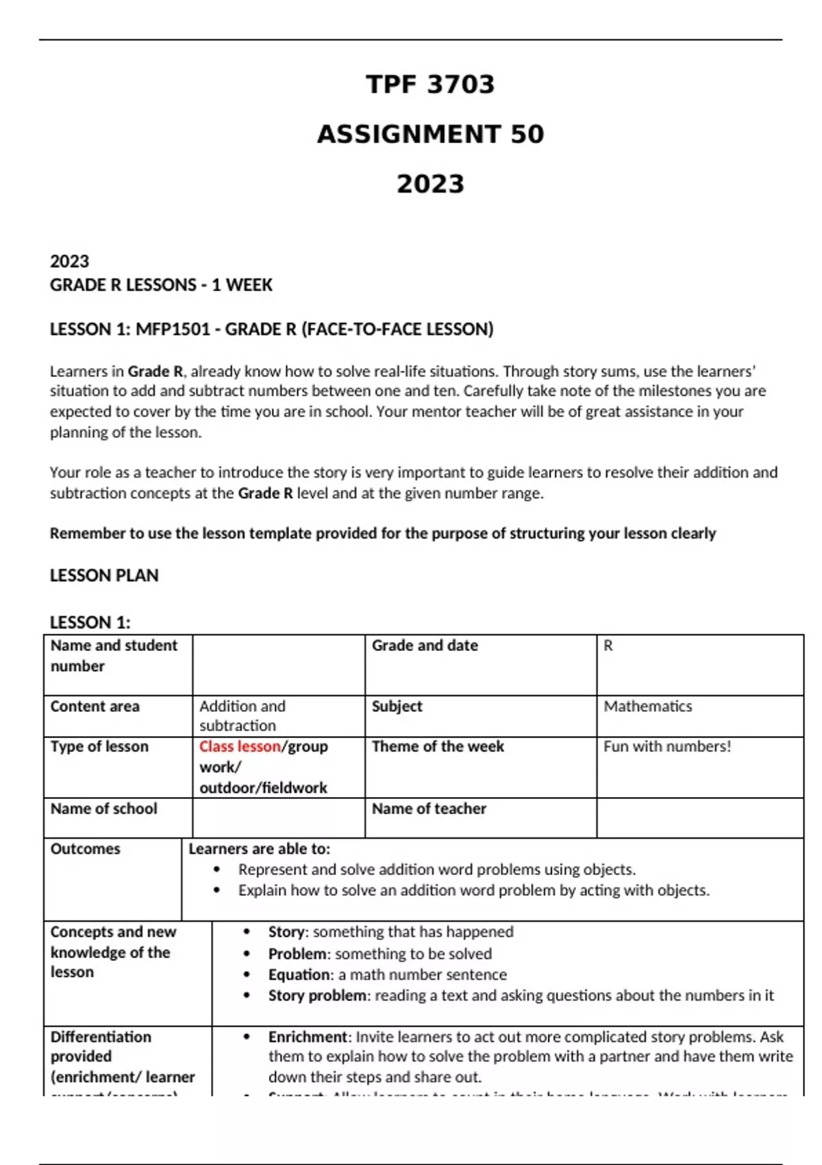 LESSON 1: MFP1501 - GRADE R (FACE-TO-FACE LESSON)