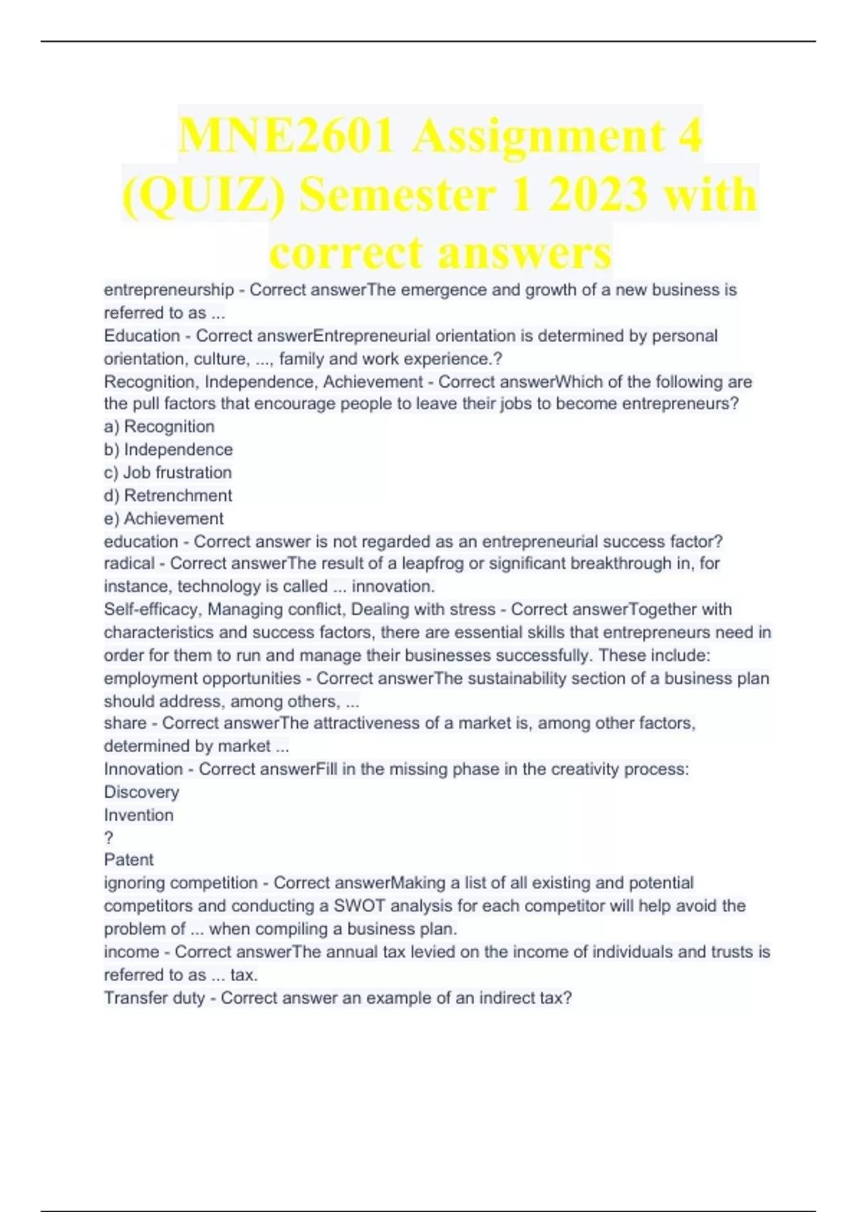 MNE2601 Assignment 4 (QUIZ) Semester 1 2023 with correct answers entrepreneurship - Correct answer-the emergence and growth of a new business is referred to as ... Education - Correct answer-entrepreneurial orientation is determined by personal orientation, culture, ..., family and work experience.? Recognition, Independence, Achievement - Correct answer-which of the following are the pull factors that encourage people to leave their jobs to become entrepreneurs? a) Recognition b) Independence c) Job frustration d) Retrenchment e) Achievement education - Correct answer is not regarded as an entrepreneurial success factor? radical - Correct answer The result of a leapfrog or significant breakthrough in, for instance, technology is called ... innovation. Self-efficacy, Managing conflict, Dealing with stress - Correct answer-together with characteristics and success factors, there are essential skills that entrepreneurs need in order for them to run and manage their businesses successfully. These include: employment opportunities - Correct answerThe sustainability section of a business plan should address, among others, ... share - Correct answerThe attractiveness of a market is, among other factors, determined by market ... Innovation - Correct answerFill in the missing phase in the creativity process: Discovery Invention ? Patent ignoring competition - Correct answerMaking a list of all existing and potential competitors and conducting a SWOT analysis for each competitor will help avoid the problem of ... when compiling a business plan. income - Correct answerThe annual tax levied on the income of individuals and trusts is referred to as ... tax. Transfer duty - Correct answer an example of an indirect tax?