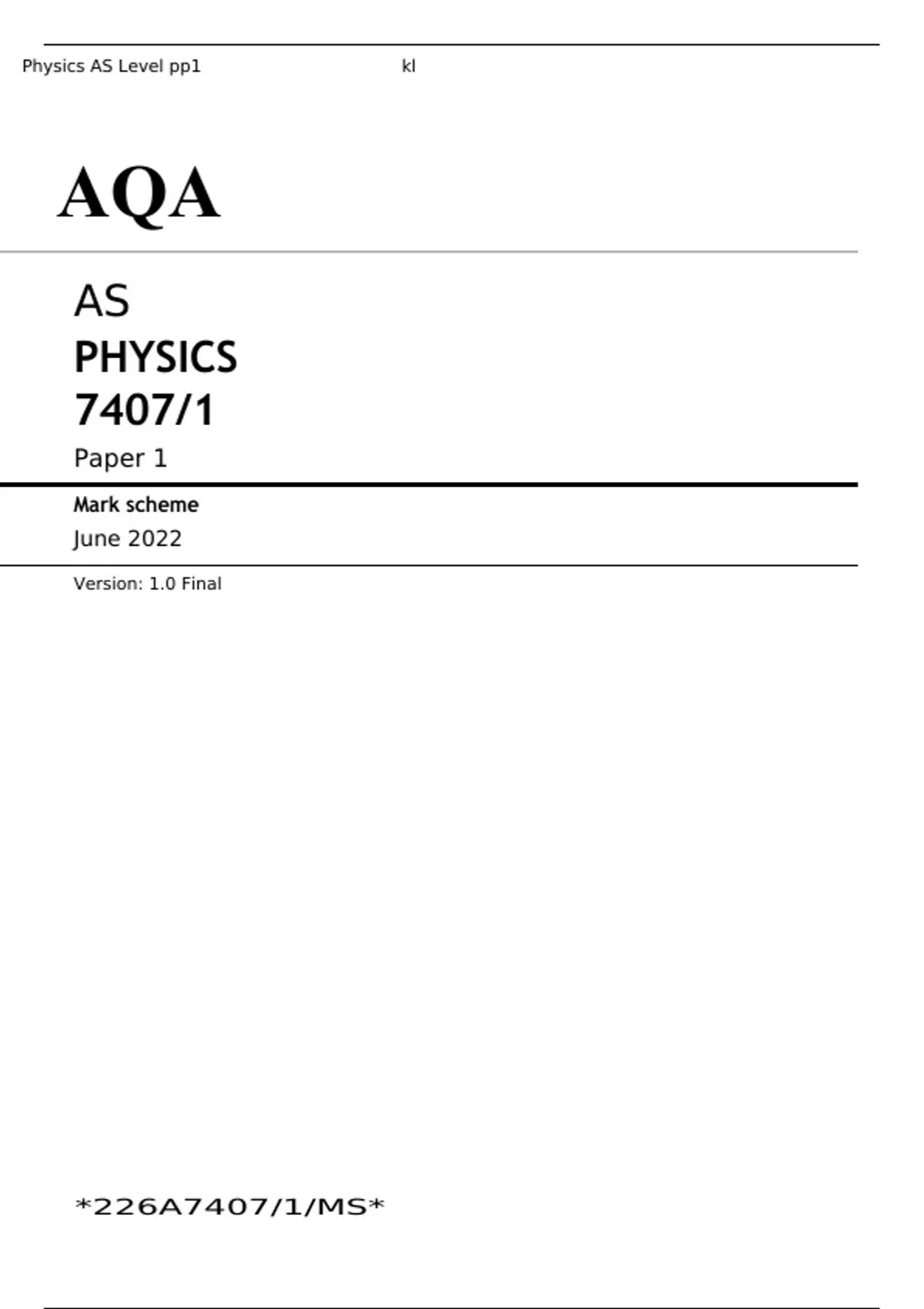AQA AS PHYSICS 7407/1 Paper 1 FINAL Mark scheme June 2022