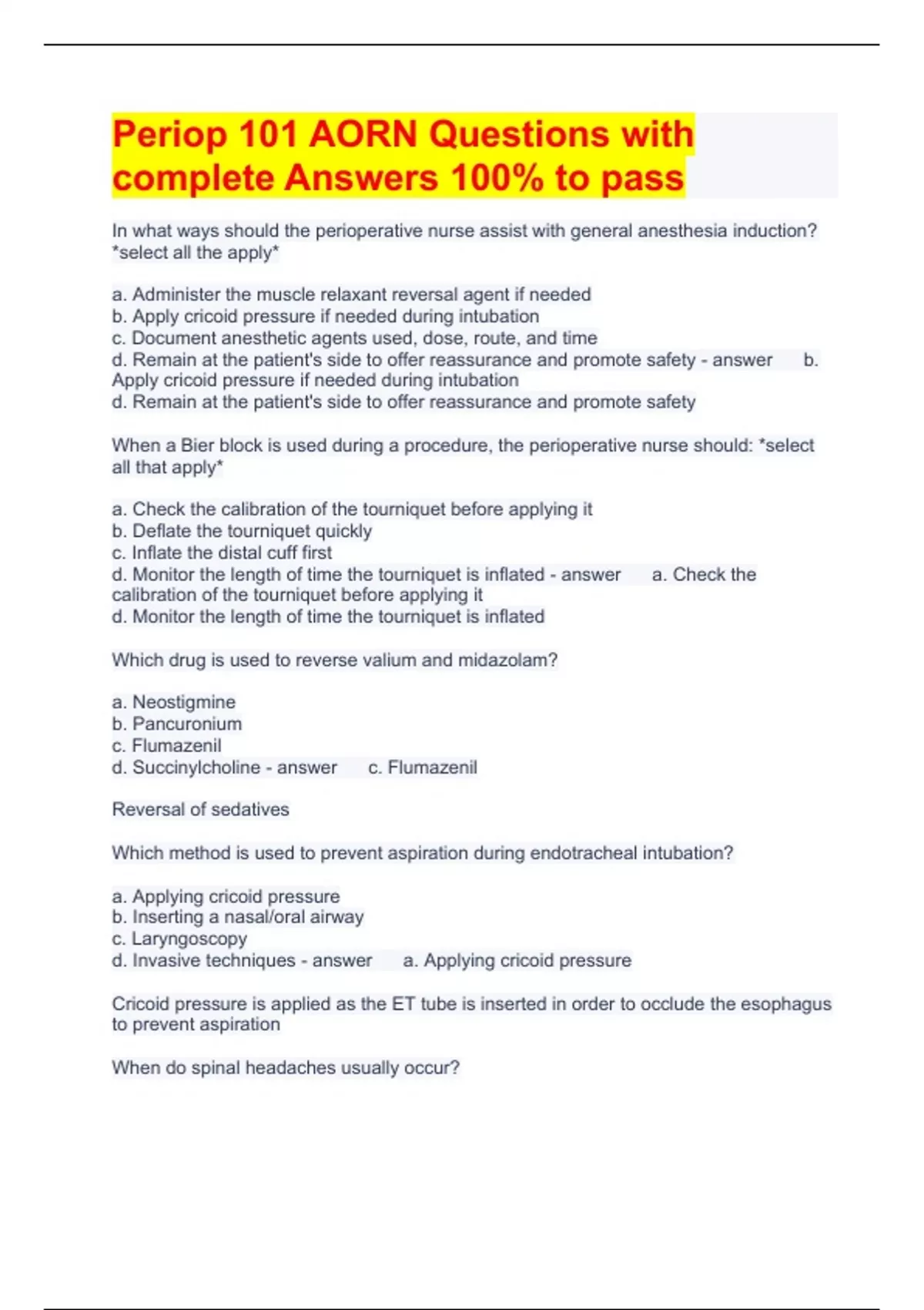 Periop 101 AORN Questions with complete Answers 100% to pass In what ways should the perioperative nurse assist with general anesthesia induction? select all the apply a. Administer the muscle relaxant reversal agent if needed b. Apply cricoid pressure if needed during intubation c. Document anesthetic agents used, dose, route, and time d. Remain at the patient's side to offer reassurance and promote safety b. Apply cricoid pressure if needed during intubation d. Remain at the patient's side to offer reassurance and promote safety When a Bier block is used during a procedure, the perioperative nurse should: select all that apply a. Check the calibration of the tourniquet before applying it b. Deflate the tourniquet quickly c. Inflate the distal cuff first d. Monitor the length of time the tourniquet is inflated a. Check the calibration of the tourniquet before applying it d. Monitor the length of time the tourniquet is inflated Which drug is used to reverse valium and midazolam? a. Neostigmine b. Pancuronium c. Flumazenil d. Succinylcholine c. Flumazenil Reversal of sedatives Which method is used to prevent aspiration during endotracheal intubation? a. Applying cricoid pressure b. Inserting a nasal/oral airway c. Laryngoscopy d. Invasive techniques a. Applying cricoid pressure Cricoid pressure is applied as the ET tube is inserted in order to occlude the esophagus to prevent aspiration When do spinal headaches usually occur? a. After 40 years of age b. During anesthesia c. Postoperatively d. Before surgery c. Postoperatively During intravenous regional anesthesia (Bier Block), the tourniquet should be deflated slowly to prevent which of the following from entering the circulation? a. Bacteria b. Lymphatic fluids c. Thrombus d. Bolus of anesthetic d. Bolus of anesthetic In intravenous regional anesthesia, the tourniquet should be deflated slowly to prevent a bolus of local anesthetic from entering the system circulation What is the most consistent indicator of malignant hyperthermia during a surgical intervention? a. Tachycardia b. Unexplained increase in end-tidal CO2 c. Elevated temperature d. Sustained muscle contraction b. Unexplained increase in end-tidal CO2 An increase in end-tidal CO2 is the most consistent indicator of MH, however, tachycardia, hyperkalemia, lactic acidosis, and increased oxygen demand are some other signs of MH. Which is NOT a protocol for treatment during an MH crisis? a. Stop all triggering agents b. Continue with safe agents c. Hyperventilate with 100% oxygen d. Administer serum potassium d. Administer serum potassium The first actions taken when treating MH are to stop all triggering agents, continue with safe agents, and hyperventilate 100% oxygen. Serum potassium is NOT administered for treatment of MH. Administration of anesthesia requires specialized equipment to provide a safe environment for the patient. Which of the following data may be monitored during surgery? Select all that apply a. Blood pressure b. Temperature c. ECG d. CBC e. Pulse oximetry f. Fluid volume status a. Blood pressure b. Temperature c. ECG e. Pulse oximetry f. Fluid volume status Which of the following assessment factors are important to include when screening patients for potential risk of malignant hyperthermia? a. Family history of problems related to anesthesia b. Patient's previous experience with anesthesia c. Patient's use of herbal and vitamin supplements d. Patient's use of over-the-counter medications a. Family history of problems related to anesthesia b. Patient's previous experience with anesthesia