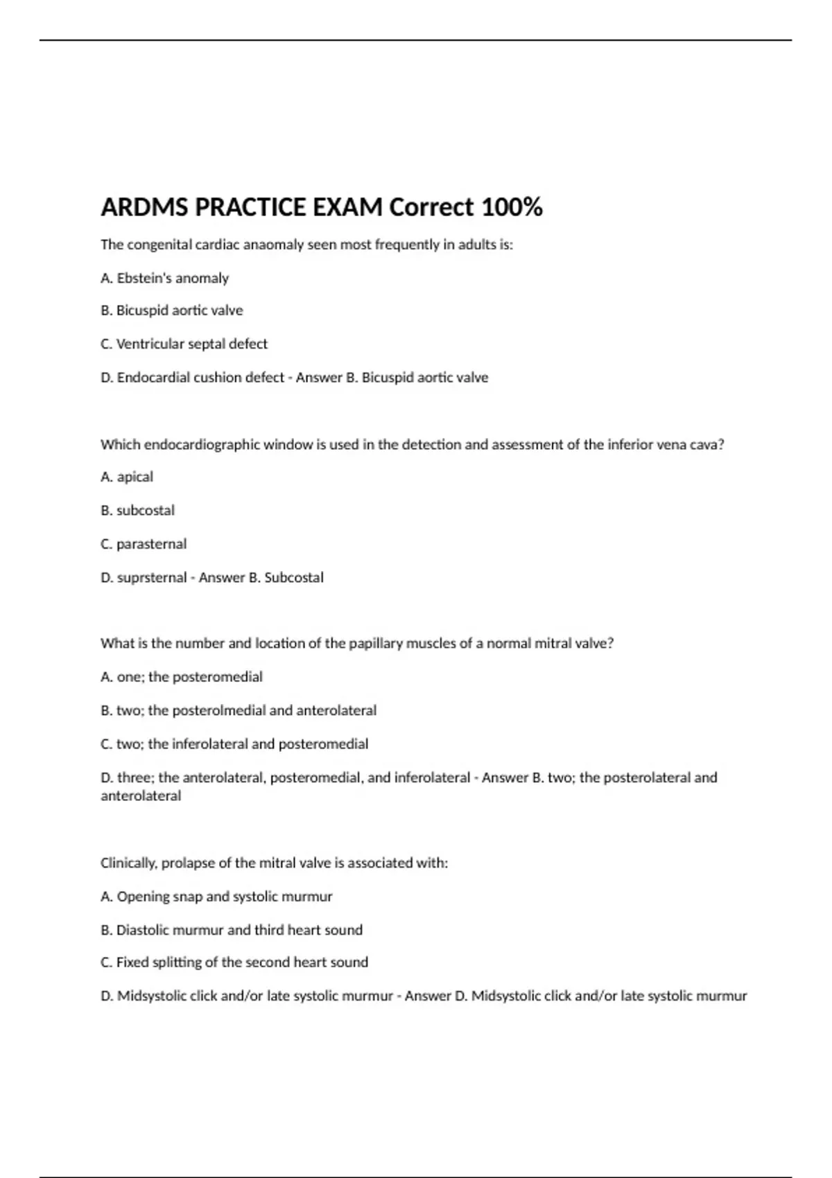 The congenital cardiac anaomaly seen most frequently in adults is: A. Ebstein's anomaly B. Bicuspid aortic valve C. Ventricular septal defect D. Endocardial cushion defect - Answer B. Bicuspid aortic valve Which endocardiographic window is used in the detection and assessment of the inferior vena cava? A. apical B. subcostal C. parasternal D. suprsternal - Answer B. Subcostal What is the number and location of the papillary muscles of a normal mitral valve? A. one; the posteromedial B. two; the posterolmedial and anterolateral C. two; the inferolateral and posteromedial D. three; the anterolateral, posteromedial, and inferolateral - Answer B. two; the posterolateral and anterolateral Clinically, prolapse of the mitral valve is associated with: A. Opening snap and systolic murmur B. Diastolic murmur and third heart sound C. Fixed splitting of the second heart sound D. Midsystolic click and/or late systolic murmur - Answer D. Midsystolic click and/or late systolic murmur Papillary muscle dysfunction usually results from: A. Dressler's syndrome B. Ischemic heart disease C. Bacterial endocarditis D. Rheumatic heart disease - Answer B. Ischemic heart disease In order to record the vegetation's of endocarditis by echo, the vegetation's must have a diameter of at least: A. One centimeter B. Three millimeters C. Three centimeters D. Five millimeters - Answer B. Three millimeters How many veins connect the pulmonary vascular bed with the left atrium in the normal heart? A. one B. two C. three D. four - Answer D. four Which M-mode finding is considered to be a specific indicator of a fenestrated aortic valve? a. diastolic flutter of the mitral valve b. premature opening of the aortic valve c. diastolic flutter of the aortic valve d. eary systolic closure of the aortic valve - Answer c. diastolic flutter of the aortic valve Which cardiac abnormalities are frequently noted on the echocardiogram of patients with Marfan's syndrome? A. mitral stenosis and pericardial effusion B. mitral valve prolapse and aortic dilatation C. left ventricular aneurysm and thrombus formation D. dilatation of the pulmonary artery and pulmonic stenosis - Answer b. mitral valve prolapse and pericardial effusion Which term is used to describe a segment of ventrcular wall that exhibits no motion? A. akinesis B. dyskinesis C. hypokinesis D. hyperkinesis - Answer A. akinesis A true aneurysm of the left ventricle can usually be distinguished from a pseudoaneurysm because a pseudoaneurysm: A. has a smaller, more narrow neck than a true aneurysm B. never contain thrombi whereas a true aneurysm always contain a layered thrombus C. is always larger in overall size than a true aneurysm - Answer A. has a smaller, more narrow neck than a true aneurysm Which type of cardiomyopathy is associated with amyloidosis? a. congestive b. restrictive c. hypertrophic d. infiltrative - Answer d. infiltrative In a patient with carcinoid heart disease, the cardiac sonographer must devote special attention to identifying abnormalilties of the: a. aortic arch b. aortic valve c. mitral valve d. tricuspid valve - Answer d. tricuspid Which two-dimensional echocardiographic view is best for identifying the malformed tricuspid valve apparatus that characterizes Ebstein's anomaly: a. apical two chamber b. apical four chamber c. parasternal long axis d. parasternal short axis - Answer b. apical four chamber Infundibular pulmonary stenosis is uncommon as an isolated lesion and is usually associated with: a. tricuspid atresia b. atrial septal defect c. coarctation of the aorta d. ventricular septal defect - Answer d. Ventricular septal defect Which two-dimensional echocardiographic view is best for the assessment of the interatrial septum? a. apical long axis b. apical four chamber c. parasternal short axis d. subcostal four chamber - Answer d. subcostal The most common type of atrial septal defect is the: a. ostium primum b. sinus venosus c. coronary sinus d. ostium secundum - Answer d. ostium secundum M-mode echo demenstration of mid-systolic closure of the pulmonary valve along with a decreased "a" wave is most consistent with: a. pulmonary hypertension b. pulmonary insufficiency c. valvular pulmonary stenosis d. infundibular pulmonary stenosis - Answer a. pulmonary hypertension False overriding of the aorta may be produced on the M-mode echo by: a. using a transducer with too low a frequency b. failure to turn the patient into a left decubitus position c. positioning the transducer in too high an intercostal space d. positioning the transducer in too low an intercostal space - Answer c. positioning the transducer in too high an intercostal space Atrial fibrillation is most commonly associated with which valvular disease? a. bicuspid aortic valve b. mitral valve prolapse c. calcific aortic stenosis d. rheumatic mitral stenosis - Answer d. rheumatic mitral stenosis Which is an example of a bioprosthetic cardiac valve? a. Starr-Edwards ball b. Bjork-Shiley tilting disc c. St.Jude Medical bileaflet d. Ionescu-Shiley bovine pericardial - Answer D. Ionescu-Shiley bovine pericardial Doppler measures a pressure drop (gradient) by the Bernoulli equation. This equation actually measures the ___gradient across the valve. a. mean b. peak to peak c. peak instantaneous d. pressure half-time - Answer c. peak instantaneous When a patient has a clinical diagnosis of pericarditis: a. a pericardal effusion is always present on echo b. a pericardial effusion may not be present on echo c. pericardial thickening is always present on echo d. pericardial thickening must not be present on echo - Answer B. a pericardial effusion may not be present on echo In normal patients, most ventricular filling occurs: a. with atrial contraction b. in the first third of diastole c. in the middle third of diastole d. during the PR interval of the ECG - Answer b. in the first third of diastole The patient you are examining has clear cut auscultatory and angiographic evidence for mital prolapse, y
