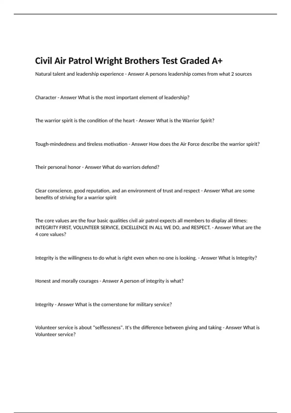 Natural talent and leadership experience - Answer A persons leadership comes from what 2 sources Character - Answer What is the most important element of leadership? The warrior spirit is the condition of the heart - Answer What is the Warrior Spirit? Tough-mindedness and tireless motivation - Answer How does the Air Force describe the warrior spirit? Their personal honor - Answer What do warriors defend? Clear conscience, good reputation, and an environment of trust and respect - Answer What are some benefits of striving for a warrior spirit The core values are the four basic qualities civil air patrol expects all members to display all times: INTEGRITY FIRST, VOLUNTEER SERVICE, EXCELLENCE IN ALL WE DO, and RESPECT. - Answer What are the 4 core values? Integrity is the willingness to do what is right even when no one is looking. - Answer What is Integrity? Honest and morally courages - Answer A person of integrity is what? Integrity - Answer What is the cornerstone for military service? Volunteer service is about "selflessness". It's the difference between giving and taking - Answer What is Volunteer service? Excellence is no matter what challenge is facing you, you will give it your best effort - Answer What is Excellence? making a commitment to continuous self-improvment - Answer How do you display excellence? To defend human dignity - Answer What does respect challenge cadets to do? By treating others as they would like to be treated. - Answer How is a person respectful? That even strangers act in good faith - Answer What does respect make you assume? That each individual is unique and accepts the for who they are, in a spirit of tolerance - Answer What does a respectful person understand? to know how well you are living up to the ideals of the Core Values. Also, the ability to monitor and judge your own actions - Answer What is self-awareness? Honesty, and being able to understand their strengths and weaknesses - Answer What does self-awareness require? the ability to direct your thoughts, emotions, and actions toward and meaningful purpose. - Answer What is self-discipline? strengthening work habits, practicing on the drill field and by wearing their uniform properly. - Answer How do you develop self-discpline? Attitude is the state of mind that lies behind your every action - Answer What is Attitude?