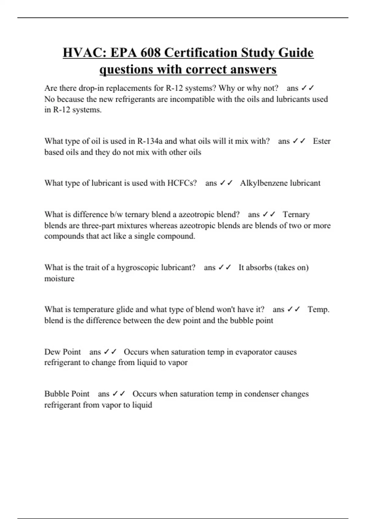 Are there drop-in replacements for R-12 systems? Why or why not? ans No because the new refrigerants are incompatible with the oils and lubricants used in R-12 systems. What type of oil is used in R-134a and what oils will it mix with? ans Ester based oils and they do not mix with other oils What type of lubricant is used with HCFCs? ans Alkylbenzene lubricant What is difference b/w ternary blend a azeotropic blend? ans Ternary blends are three-part mixtures whereas azeotropic blends are blends of two or more compounds that act like a single compound. What is the trait of a hygroscopic lubricant? ans It absorbs (takes on) moisture What is temperature glide and what type of blend won't have it? ans Temp. blend is the difference between the dew point and the bubble point Dew Point ans Occurs when saturation temp in evaporator causes refrigerant to change from liquid to vapor Bubble Point ans Occurs when saturation temp in condenser changes refrigerant from vapor to liquid