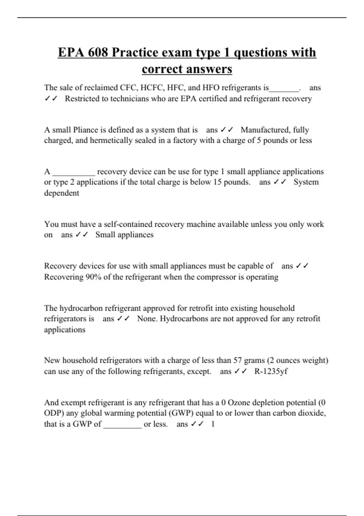 The sale of reclaimed CFC, HCFC, HFC, and HFO refrigerants is_______. ans Restricted to technicians who are EPA certified and refrigerant recovery A small Pliance is defined as a system that is ans Manufactured, fully charged, and hermetically sealed in a factory with a charge of 5 pounds or less A __________ recovery device can be use for type 1 small appliance applications or type 2 applications if the total charge is below 15 pounds. ans System dependent You must have a self-contained recovery machine available unless you only work on ans Small appliances Recovery devices for use with small appliances must be capable of ans Recovering 90% of the refrigerant when the compressor is operating The hydrocarbon refrigerant approved for retrofit into existing household refrigerators is ans None. Hydrocarbons are not approved for any retrofit applications New household refrigerators with a charge of less than 57 grams