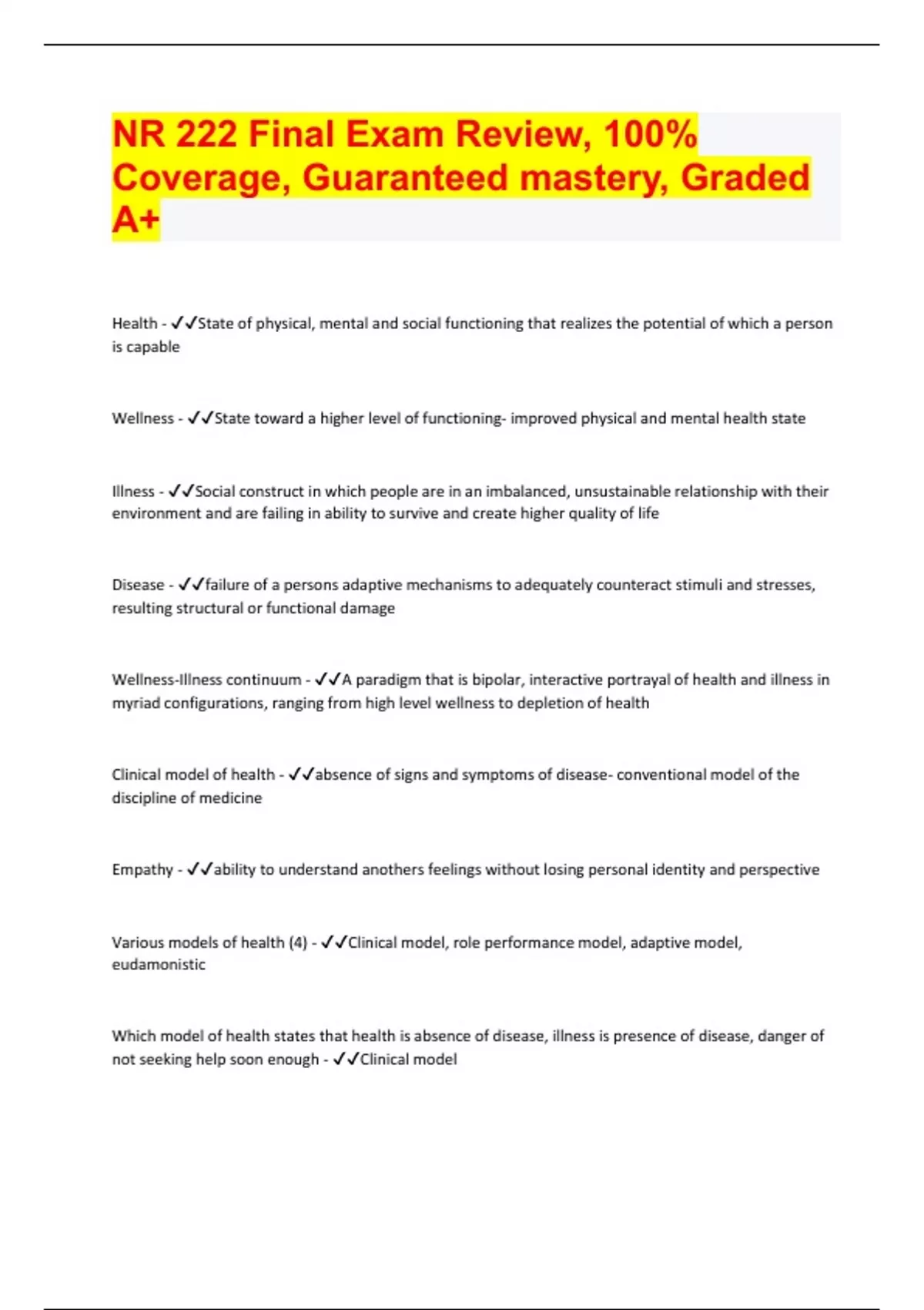 NR 222 Final Exam Review, 100% Coverage, Guaranteed mastery, Graded A+ Document Content and Description Below NR 222 Final Exam Review, 100% Coverage, Guaranteed mastery, Graded A+ Health - State of physical, mental and social functioning that realizes the potential of which a person is capable Wellness - State toward a higher level of functioning- improved physical and mental health state Illness - Social construct in which people are in an imbalanced, unsustainable relationship with their environment and are failing in ability to survive and create higher quality of life Disease - failure of a persons adaptive mechanisms to adequately counteract stimuli and stresses, resulting structural or functional damage Wellness-Illness continuum - A paradigm that is bipolar, interactive portrayal of health and illness in myriad configurations, ranging from high level wellness to depletion of health Clinical model of health - absence of signs and symptoms of disease- conventional model of the discipline of medicine Empathy - ability to understand anothers feelings without losing personal identity and perspective Various models of health (4) - Clinical model, role performance model, adaptive model, eudamonistic Which model of health states that health is absence of disease, illness is presence of disease, danger of not seeking help soon enough - Clinical model Which model of health is the persons ability to participate in work, family and community - Role-performance model Which model of health is the ability to positively make changes in health conditions - Adaptive model Which model of health states that the exuberant well-being indicates optimal health - Eudamonistic model Helps to guide health system to promote health, helps to form healthcare for everybody, eliminates health disparity, increases healthy life span and provides preventative care. - Health people 2020 Levels of prevention - Primary- prevention Secondary- Assessment and Treatment Tertiary- Follow up care Which level of prevention is the prevention of smoking - Primary Which level of prevention is the care of respiratory patient - Secondary Which level of prevention is promotion strategies to improve life with COPD - Tertiary Gordons 11 functional health patterns - Health-perception/health-management Nutritional-metabolic Elimination Activity-Exercise Sleep-rest Cognitive-Perceptual Self-perception/concept Roles-relationships Sexuality-Reproductive Coping-stress tolerance Values-beliefs Acculturation - Adapting to or borrowing traits from another culture Culture - Shared patterns of values/behaviors- shaped by cultural group Ethnic group - Group set apart on basis of cultural/national origin characteristics Ethnicity - Sense of collective identity, distinctiveness, sharing of customs, food, dress, language Health disparities - Wide variations in health services/health status among certain population groups Race - Categorizations of people based on physical properties and biological heredity Trans-cultural nursing - transforms health care for diverse populations Values clarification - Method for discovering ones values and the importance of these values What are considered to be the emerging populations in the United States? - Ethnic minorities, homeless, those with AIDS/HIV What are considered to be the primary health concerns for the homeless population? - Survival issues, respiratory or infectious disease; dental/vision problems; mental health and substance abuse What are considered to be the primary health concerns for the Arab population? - Diabetes, coronary heart disease, acculturation, mental health, teen smoking What are considered to be the primary health concerns for the Asian population? - Hesitancy for care, tuberculosis, mental health What are considered to be the primary health concerns for the Hispanic population? - Stomach cancer, diabetes, CV disease, HIV What are considered to be the primary health concerns for the Black population? - Cancer, HIV, hypertension, obesity, mental health What are considered to be the primary health concerns for the Native American population? - Smoking, substance abuse, cirrhosis, diabetes, suicide Advanced Practice nurses - Nurses with advanced education beyond BA- manage and deliver health care services to all Advocate - One who pleads the cause of another Health care reform - Obamacare Health Maintenance Organization - the prototypical managed care structure that encompasses 2 possibilities: health plan where providers assume the financial risk OR a health plan that uses primary care providers as gatekeepers. Hospitalist - a physician whose professional focus is caring for hospitalized individuals Lobbyist - Registered representative of a special interest group Managed care - System that seeks to manage the cost, quality, and access of health care. Medicaid - Combined federal and state program- provides access to care for the poor and medically needy of all ages Medicare - federal health insurance program that finacnces health care for those over 65, those disable, and those with end-stage renal disease Preferred Provider Organizations - Network of providers who agree to deliver serviced for discounted fee -no financial risk to provide Primary Care - basic health care that emphasizes health needs rather than specialized care- PREVENTION What is CMS and what do they do? - Centers for Medicare/Medicare and CHIP. Branch of US dept of health and human services. Federal agency which administers Medicare, Medicaid and CHIP; and provides info to health professions, regional governments and consumers. What is WHO and what do they do? - World Health Organization- responsible for providing leaderships on global health matters, shaping health research agenda, setting norms and standards, evidenced based policy options, providing tech support to countries, monitoring and assessing health trends How do official agencies impact nursing and healthcare? - They provide information and promote chang
