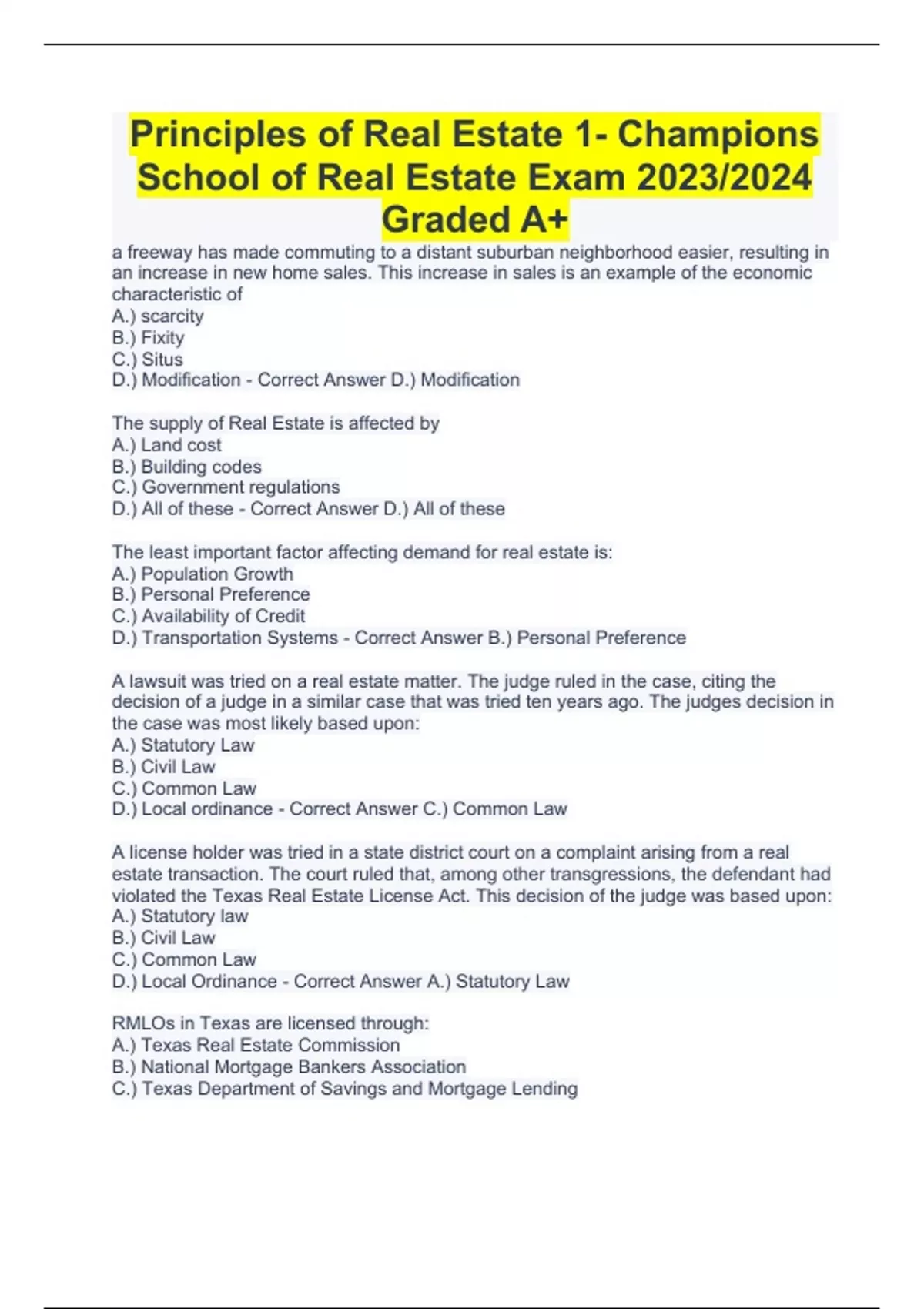 a freeway has made commuting to a distant suburban neighborhood easier, resulting in an increase in new home sales. This increase in sales is an example of the economic characteristic of A.) scarcity B.) Fixity C.) Situs D.) Modification - Correct Answer D.) Modification The supply of Real Estate is affected by A.) Land cost B.) Building codes C.) Government regulations D.) All of these - Correct Answer D.) All of these The least important factor affecting demand for real estate is: A.) Population Growth B.) Personal Preference C.) Availability of Credit D.) Transportation Systems - Correct Answer B.) Personal Preference A lawsuit was tried on a real estate matter. The judge ruled in the case, citing the decision of a judge in a similar case that was tried ten years ago. The judges decision in the case was most likely based upon: A.) Statutory Law B.) Civil Law C.) Common Law D.) Local ordinance - Correct Answer C.) Common Law A license holder was tried in a state district court on a complaint arising from a real estate transaction. The court ruled that, among other transgressions, the defendant had violated the Texas Real Estate License Act. This decision of the judge was based upon: A.) Statutory law B.) Civil Law C.) Common Law D.) Local Ordinance - Correct Answer A.) Statutory Law RMLOs in Texas are licensed through: A.) Texas Real Estate Commission B.) National Mortgage Bankers Association C.) Texas Department of Savings and Mortgage Lending