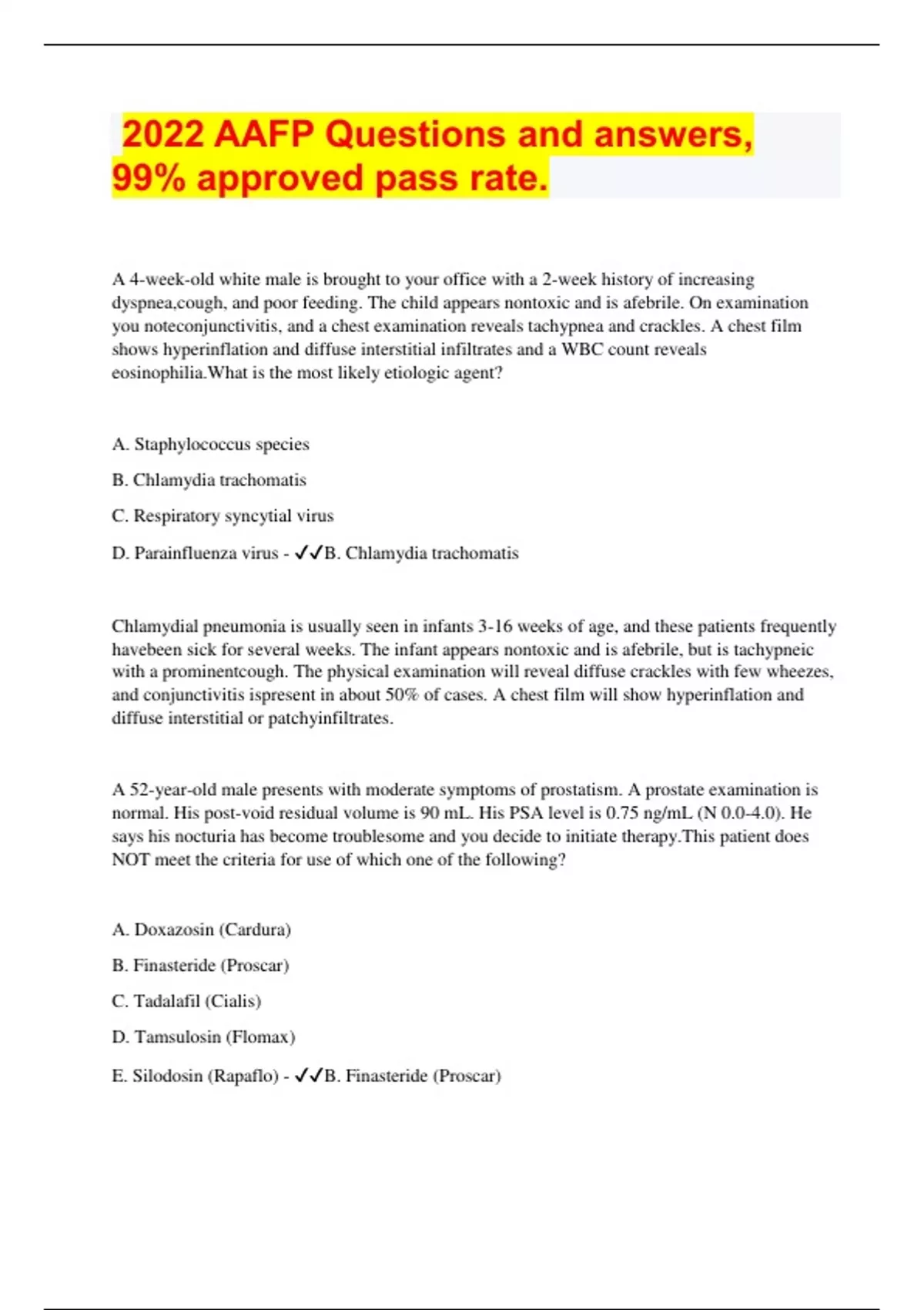 2022 AAFP Questions and answers, 99% approved pass rate. Document Content and Description Below 2022 AAFP Questions and answers, 99% approved pass rate. A 4-week-old white male is brought to your office with a 2-week history of increasing dyspnea,cough, and poor feeding. The child appears nontoxic and is afebrile. On examination you noteconjunctivitis, and a chest examination reveals tachypnea and crackles. A chest film shows hyperinflation and diffuse interstitial infiltrates and a WBC count reveals eosinophilia.What is the most likely etiologic agent? A. Staphylococcus species B. Chlamydia trachomatis C. Respiratory syncytial virus D. Parainfluenza virus - B. Chlamydia trachomatis Chlamydial pneumonia is usually seen in infants 3-16 weeks of age, and these patients frequently havebeen sick for several weeks. The infant appears nontoxic and is afebrile, but is tachypneic with a prominentcough. The physical examination will reveal diffuse crackles with few wheezes, and conjunctivitis ispresent in about 50% of cases. A chest film will show hyperinflation and diffuse interstitial or patchyinfiltrates. A 52-year-old male presents with moderate symptoms of prostatism. A prostate examination is normal. His post-void residual volume is 90 mL. His PSA level is 0.75 ng/mL (N 0.0-4.0). He says his nocturia has become troublesome and you decide to initiate therapy.This patient does NOT meet the criteria for use of which one of the following? A. Doxazosin (Cardura) B. Finasteride (Proscar) C. Tadalafil (Cialis) D. Tamsulosin (Flomax) E. Silodosin (Rapaflo) - B. Finasteride (Proscar) Pharmacologic options for benign prostatic hyperplasia and lower urinary tract symptoms include an α-adrenergic blocker, a 5-α-reductase inhibitor (if there is evidence of prostatic enlargement or a PSA level >1.5 ng/mL), a phosphodiesterase-5 inhibitor, or antimuscarinic therapy. The first three have proven efficacy as monotherapies. Finasteride is a 5-α-reductase inhibitor A factory worker sustains a forced flexion injury of the distal interphalangeal (DIP) joint,resulting in a small bone fragment at the dorsal surface of the proximal distal phalanx (malletfracture). Which one of the following is the most appropriate management strategy? A. Buddy taping and early range of motion B. Splinting the DIP joint in extension C. Splinting the DIP joint in flexion D. Referral for surgical repair - B. Splinting the DIP joint in extension The recommended treatment for a mallet fracture is splinting the distal interphalangeal (DIP) joint inextension (SOR B). The usual duration of splinting is 8 weeks. It is important that extension be maintained throughout the duration of treatment because flexion can affect healing and prolong the time needed for treatment. If the finger fracture involves >30% of the intra-articular surface, referral to a hand ororthopedic surgeon can be considered. However, conservative therapy appears to have outcomes similarto those of surgical treatment and therefore is generally preferred. Which one of the following drugs is NOT effective for maintenance therapy in bipolar disorders? (check one) A. Haloperidol B. Lamotrigine (Lamictal) C. Lithium D. Quetiapine (Seroquel) E. Valproate sodium (Depacon) - A. Haloperidol Lithium, valproate, lamotrigine, and some antipsychotics (including quetiapine) are effective treatmentsfor both acute depression and maintenance therapy of bipolar disorders. Haloperidol is an effectivetreatment for acute mania in bipolar disorders, but not for maintenance therapy or acute depression. Acne appearing at which one of the following ages should prompt detailed endocrine laboratory testing for possible underlying systemic disease? A. 3 weeks B. 7 months C. 5 years D. 9 years E. 13 years - C. 5 years As many as 20% of newborns will be affected by neonatal acne, usually in the form of pustules confined to the cheeks, chin, eyelids, and forehead. This is typically mild, self-limited, and best managed by reassuring the parents. Acne can also appear in infants, typically males 6-12 months of age, and is also usually self-limited and not associated with underlying endocrine pathology in the absence of any other findings suggesting hormonal abnormalities such as clitoromegaly, breast or testicular development, pubic hair growth, hirsutism, or a growth abnormality consistent with increased muscle development. Acne appearing during mid-childhood is rare and, if present, warrants referral for extensive laboratory testing to identify an underlying endocrine abnormality. Preadolescents and adolescents are very likely to develop acne as a result of normal ovarian/testicular development. In the absence of other findings to suggest an endocrine problem, developing an effective treatment regimen is most appropriate for these individuals. Patients being treated with amiodarone (Cordarone) should be monitored periodically with serumlevels of A. cortisol B. creatine phosphokinase C. creatine D. LDH E. TSH - E. TSH Patients on amiodarone can develop either hyperthyroidism or hypothyroidism. It is recommended that apatient on amiodarone have baseline thyroid function tests (free T4, TSH) with follow-up testing every 6months to monitor for these conditions. Hyperadrenalism and hypoadrenalism are not associated withamiodarone treatment. A mother brings her 2-year-old daughter to your office because the child is not using her leftarm. Earlier in the day the mother left the toddler under the supervision of her 12-year-old sisterwhile she went to the store. When she returned the toddler was playing with toys using only herright arm, and was holding the left arm slightly pronated, flexed, and close to her body. Theolder daughter was unaware of any injury to the girl's arm, and the child does not seemdistressed or traumatized. Physical examination of the child's clavicle, shoulder, wrist, and hand do not elicit any signs ofpain or change in function. She does seem to have some tenderness near the lateral e