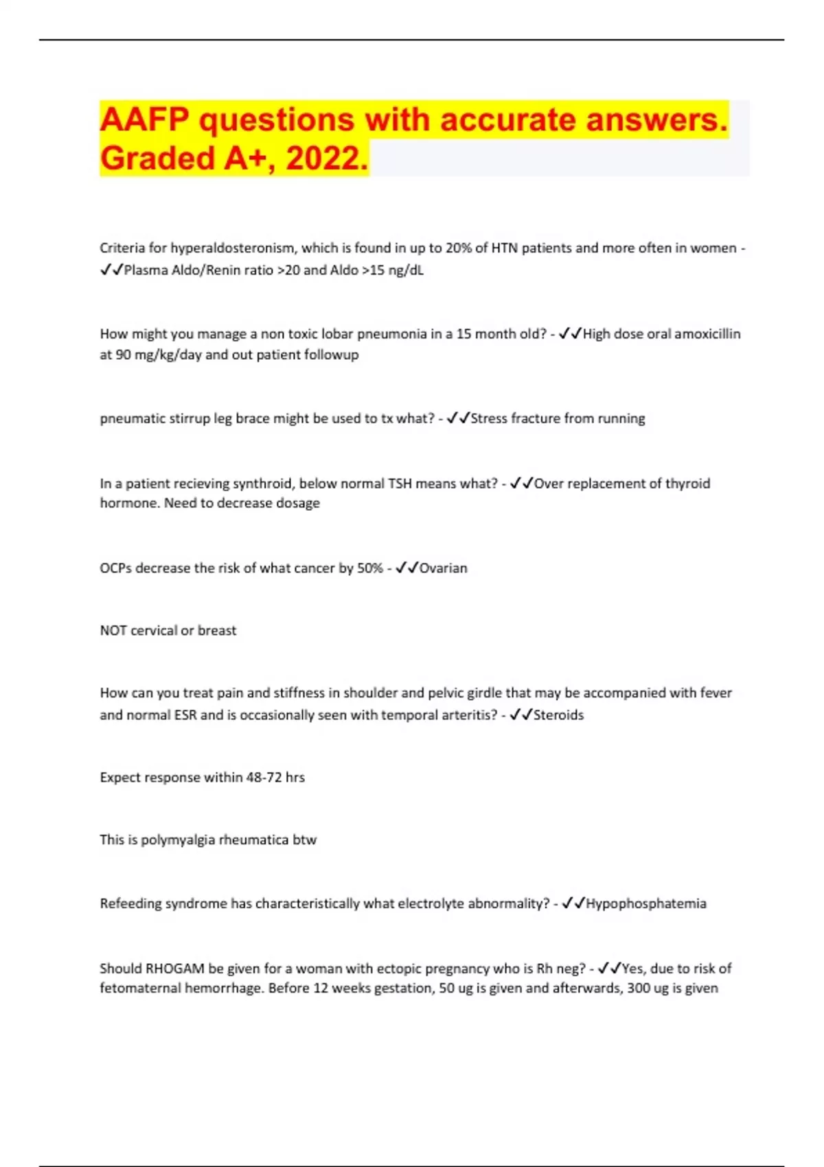AAFP questions with accurate answers. Graded A+, 2022. Document Content and Description Below Criteria for hyperaldosteronism, which is found in up to 20% of HTN patients and more often in women - Plasma Aldo/Renin ratio >20 and Aldo >15 ng/dL How might you manage a non toxic lobar pn eumonia in a 15 month old? - High dose oral amoxicillin at 90 mg/kg/day and out patient followup pneumatic stirrup leg brace might be used to tx what? - Stress fracture from running In a patient recieving synthroid, below normal TSH means what? - Over replacement of thyroid hormone. Need to decrease dosage OCPs decrease the risk of what cancer by 50% - Ovarian NOT cervical or breast How can you treat pain and stiffness in shoulder and pelvic girdle that may be accompanied with fever and normal ESR and is occasionally seen with temporal arteritis? - Steroids Expect response within 48-72 hrs This is polymyalgia rheumatica btw Refeeding syndrome has characteristically what electrolyte abnormality? - Hypophosphatemia Should RHOGAM be given for a woman with ectopic pregnancy who is Rh neg? - Yes, due to risk of fetomaternal hemorrhage. Before 12 weeks gestation, 50 ug is given and afterwards, 300 ug is given Most sensitive method for determining is someone is at risk for a bleed during surgery - Find out about bleeding history :) Contraindications to the use of electrosurgery? - Pacemaker use and Melanoma skin lesions (should not be excised with electrosugery) Which seizure drug can lead to secondary osteoporosis? - Phenytoin Is hyper or hypo thyroidism a risk factor for OA of hip? - Hypothyroid What else do you want to give to a pt started on prednisone for >3 months at a dosage of >5mg per day - Bisphosphonate along with Ca and Vit D A 19-year-old white male with a history of fever, fatigue, weight loss, and mild diarrhea of 2 months' duration is found to have a palpable mass in the right lower quadrant of the abdomen. The most likely diagnosis is - Crohn's disease Maximum daily dosage for all acetaminophen preparations - 4,000 mg Risk of sudden cardiac death may be prevented with what anti-inflammatory, anti platelet aggregation and anti-arrhythmic substance? - Omega 3 fatty acid The sequence of meds in managing SVT includes - Carotid massage -> adenosine -> IV verapamil or beta blocker -> flecainide or propafenone Monotherapy for HTN in AAs is more likely to consist of - Diuretics or CCBs HTN in African americans is less likely to be Angiotensin II dependant Subclinical thyroid disease has what associations - Hyper (TSH < 0.1) = atrial fib, bone density drops, cardiac dysfunction Hypo (TSH >10) = increased LDL How does Lithium affect PTH? - Can cause increased PTH secretion and jack up Calcium levels. Brown to black spotting of colonic mucosa may be what? - Melanosis Coli 2/2 to absue of laxatives like cascarea, senna, aloe You find a clot in femoral vein of an old man. In addition to LMWH, how long do you give coumadin - 3 months Pain relief for osteoporotic vertebral compression fracture can include what hormone? - Calcitonin Recombinant activated protein C is shown to improve survival in what patients? - Septic shock Which treatment option for childhood nocturnal enuresis has highest cure rate and lowest relapse rate? - Bed wetting alarm Aspirin in people with no cardiac risk does more harm than good including increased bleeding and risk. Who might it benefit however? - Decreased MI in men and decreased ischemic stroke in women Frequency of colonoscopy includes - Every 10 years if healthy Every 5 years if family hx Every 3 years if polyps are found A less toxic option than Lindane for tx of head lice in 8 year old child - Malathion What NSAID is not recommended in older pts due to adverse effects on CNS? - Indomethacin Emergent management of WPW can be done with what drug? - Procainamide Antibiotics to deal with community acquired pneumonia in 82 year old who is admitted - Ceftazidime, Levofloxacin and vanco Unlike bulimia which responds to anti-depressants, anorexia nervosa best responds to - Family based treatment First and second line therapies for pertussis - (1) Macrolides (2)TMP-SMX What fetal measurement on US is most reliable estimate of gestational age up to 14 weeks? - Crown-Rump length Pathological dryness of skin in elderly preseting as itchy rash and red, scaly plaques is what - Xerosis How would you minimize pain from infiltration of local anesthetic - The pain from infiltration of local anesthetics can be decreased by using a warm solution, using small needles, and performing the infiltration slowly.It is also helpful to add sodium bicarbonate to neutralize the anesthetic since they are shipped at an acidic pH to prolong shelf life. Middle aged hairdresser presents with a complaint of soreness of the proximal nail folds of several fingers on either hand, - Chronic paronychia Topical betamethasone dipropionate Randomized, controlled trials found that luteal-phase spironolactone improved ___________________ - psychological and physical symptoms of premenstrual syndrome What is the diagnostic test for vit D deficiency? - 25 hydroxy and NOT the 1, 25 hydroxy How would you manage gestational diabetes? - Human insulin ideally. Oral agents all cross the placenta Which groups might you exclude from giving ASA - Those below 45 age and those above 80 For those in between, avoid in individuals with risk of GI hemorrhage Which asthma drug can't you use as monotherapy - LABA What drug could you use for prophylaxis of mountain sickness in someone allergic to sulfa drugs? - Dexamethasone Horse chestnut seed extract has been shown to have some effect when used orally for.... - Varicose veins In patients with pes anserine bursitis, tenderness is most likely to be noted: - along the medial proximal tibia (where the bursa is located) Bronchiolitis therapy in kids includes - Trial of inhaled bronchiodilator and continue if helpful Don't use antibiotics unless other infections (like otitis media) are present 75