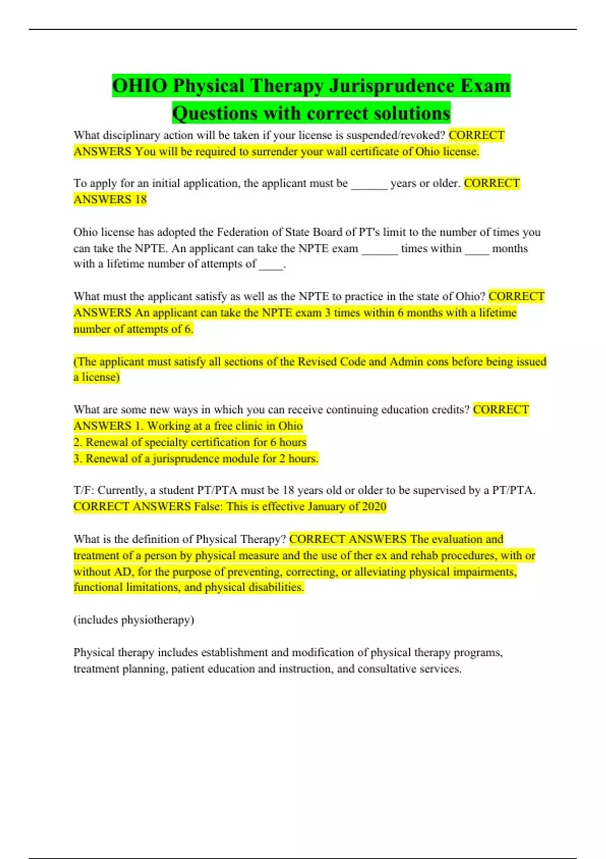 ohio physical therapy jurisprudence exam questions with correct solutions