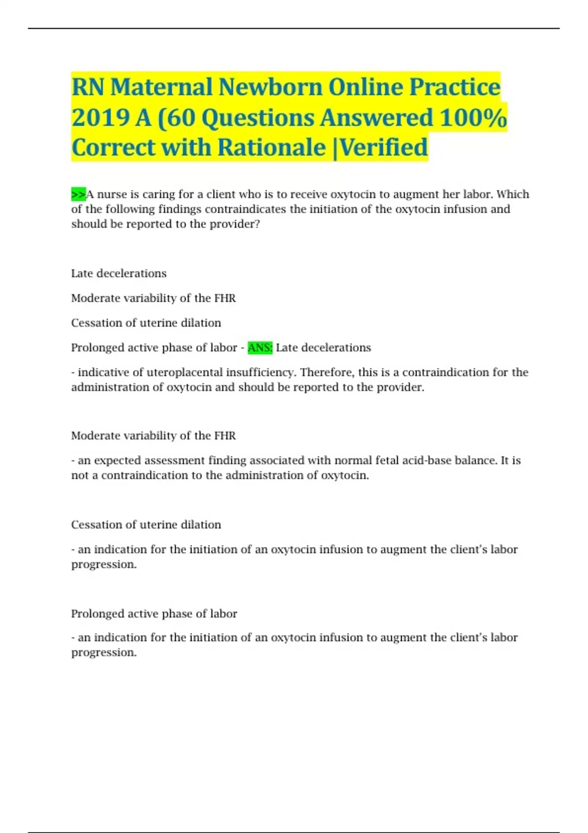 RN Maternal Newborn Online Practice 2019 A (60 Questions Answered 100% Correct with Rationale |Verified >>A nurse is caring for a client who is to receive oxytocin to augment her labor. Which of the following findings contraindicates the initiation of the oxytocin infusion and should be reported to the provider? Late decelerations Moderate variability of the FHR Cessation of uterine dilation Prolonged active phase of labor - ANS: Late decelerations - indicative of uteroplacental insufficiency. Therefore, this is a contraindication for the administration of oxytocin and should be reported to the provider. Moderate variability of the FHR - an expected assessment finding associated with normal fetal acid-base balance. It is not a contraindication to the administration of oxytocin. Cessation of uterine dilation - an indication for the initiation of an oxytocin infusion to augment the client's labor progression. Prolonged active phase of labor - an indication for the initiation of an oxytocin infusion to augment the client's labor progression. >>A nurse is caring for a patient that's 32 weeks gestation and has gonorrhea. The nurse should identify that the client is at an increased risk for which of the following complications? Excessive bleeding Oligohydramnios Premature ROM Proteinuria - ANS: Premature rupture of membranes - The nurse should identify that a client who is pregnant and has gonorrhea is at an increased risk for premature rupture of membranes, chorioamnionitis, preterm birth, neonatal sepsis, and intrauterine growth restriction. Excessive bleeding - A client who is pregnant and has gonorrhea is not at an increased risk for excessive bleeding. Oligohydramnios - A client who is pregnant and has gonorrhea is not at an increased risk for oligohydramnios. Oligohydramnios is a decrease in amniotic fluid and is associated with congenital anomalies such as renal agenesis and intrauterine growth restriction. Proteinuria - A client who is pregnant and has gonorrhea is not at an increased risk for proteinuria. Proteinuria is associated with preeclampsia. >>Nurse is performing a vag exam on a patient who is in labor and observes the umbilical cord protruding from the vagina. After calling for assistance, which actions should the nurse take? -Insert two gloved fingers into the vagina and apply upward pressure to the presenting part. -Wrap the visible cord tightly with sterile, dry gauze. -Apply oxygen to the client at 2 L/min via nasal cannula. -Place the client in the lithotomy position and apply fundal pressure. - ANS: Insert two gloved fingers into the vagina and apply upward pressure to the presenting part. - The nurse should quickly apply gloves and insert two fingers into the vagina toward the cervix, exerting upward pressure onto the presenting part to relieve umbilical cord compression and increase oxygenation to the fetus. Wrap the visible cord tightly with sterile, dry gauze. - The nurse should wrap the visible cord with a loose sterile towel saturated with warm 0.9% sodium chloride solution, rather than with sterile, dry gauze. Apply oxygen to the client at 2 L/min via nasal cannula. - The nurse should apply oxygen to the client at 8 to 10 L/min via nonbreather mask. Place the client in the lithotomy position and apply fundal pressure. - The nurse should place the client into a modified Sims position, knee-chest position, or extreme Trendelenburg to attempt to relieve the compression of the umbilical cord. >>Nurse is teaching patient of 37 weeks gestation and has a prescription for a nonstress test. Which instructions should the nurse include? -Test should take 10-15 min to complete -You will lay in supine position throughout the test -You should not eat or drink for 2 hours before the test -You should press the handheld button when you feel your baby move - ANS: "You should press the handheld button when you feel your baby move." - The nurse should instruct the client to press the handheld button when the fetus moves. This action will mark the fetal monitor tracing with the client's reports of fetal movement. This will assist in the interpretation of the nonstress test to determine if it is reactive or nonreactive. The test should take 10 to 15 minutes to complete." - The nurse should instruct the client that the nonstress will take approximately 20 to 30 min, but more time might be required if the fetus is in a sleep state when the testing begins. "You will lay in a supine position throughout the test." - The nurse should instruct the client to be positioned in a reclining chair or semi-Fowler's position with a slight lateral tilt to ensure optimal uterine perfusion. "You should not eat or drink for 2 hours before the test." - The client is not required to be NPO before or during the procedure. The nurse can suggest the client drink orange juice to increase her blood glucose level which will stimulate fetal movements.