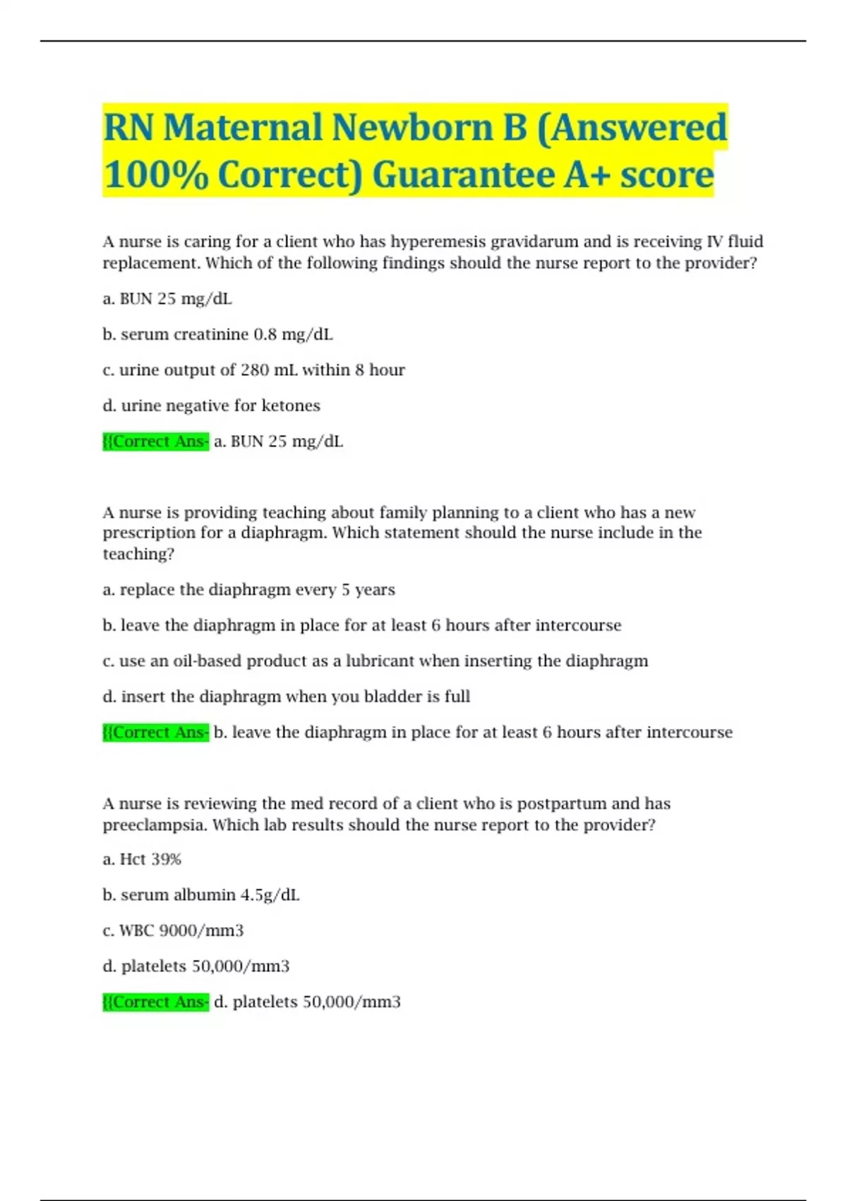 RN Maternal Newborn B (Answered 100% Correct) Guarantee A+ score A nurse is caring for a client who has hyperemesis gravidarum and is receiving IV fluid replacement. Which of the following findings should the nurse report to the provider? a. BUN 25 mg/dL b. serum creatinine 0.8 mg/dL c. urine output of 280 mL within 8 hour d. urine negative for ketones {{Correct Ans- a. BUN 25 mg/dL A nurse is providing teaching about family planning to a client who has a new prescription for a diaphragm. Which statement should the nurse include in the teaching? a. replace the diaphragm every 5 years b. leave the diaphragm in place for at least 6 hours after intercourse c. use an oil-based product as a lubricant when inserting the diaphragm d. insert the diaphragm when you bladder is full {{Correct Ans- b. leave the diaphragm in place for at least 6 hours after intercourse A nurse is reviewing the med record of a client who is postpartum and has preeclampsia. Which lab results should the nurse report to the provider? a. Hct 39% b. serum albumin 4.5g/dL c. WBC 9000/mm3 d. platelets 50,000/mm3 {{Correct Ans- d. platelets 50,000/mm3 A nurse is teaching a client about Rho(D) immune globulin. Which statement by the client indicates an understanding of the teaching? a. I will receive this med if my baby is Rh-negative b. I will receive this med when I'm in labor c. I will need a second dose of this med when my baby is 6 weeks old d. I will need this med if I have an amniocentesis {{Correct Ans- d. I will need this med if I have an amniocentesis A nurse is assessing a client who is 30 weeks gestation during a routine prenatal visit. Which findings should the nurse report to the provider? a. swelling of the face b. varicose veins in the calves c. nonpitting 1+ ankle edema d. hyperpigmentation of the cheeks {{Correct Ans- a. swelling of the face A nurse is teaching a client who is pregnant about managing nausea and vomiting. Which instructions should the nurse include in the teaching? a. brush your teeth immediately after eating b. eat foods served at a warm temp c. drink a glass of water with each meal d. eat high-carb foods {{Correct Ans- d. eat high-carb foods A nurse is developing a plan of care for a newborn who is to undergo phototherapy for hyperbilirubinemia. Which actions should the nurse include in the plan? a. feed the newborn 1oz of water q4hrs b. apply lotion to newborns skin 3x/day c. remove all clothing from newborn except diaper d. discontinue therapy if the newborn develops a rash {{Correct Ans- c. remove all clothing from newborn except diaper A nurse is caring for a client and her partner who experienced a fetal death. What action should the nurse take? a. take photos of the newborn to give to the parents b. tell the parents the can consider organ donation c. encourage the parents to avoid allowing older children to visit them in the hospital d. explain to the parents the need to name the newborn {{Correct Ans- a. take photos of the newborn to give to the parents