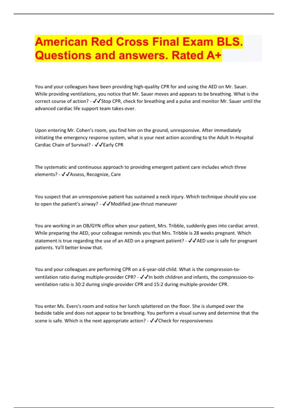 American Red Cross Final Exam BLS. Questions and answers. Rated A+ Document Content and Description Below American Red Cross Final Exam BLS. Questions and answers. Rated A+ You and your colleagues have been providing high-quality CPR for and using the AED on Mr. Sauer. While providing ventilations, y ou notice that Mr. Sauer moves and appears to be breathing. What is the correct course of action? - Stop CPR, check for breathing and a pulse and monitor Mr. Sauer until the advanced cardiac life support team takes over. Upon entering Mr. Cohen's room, you find him on the ground, unresponsive. After immediately initiating the emergency response system, what is your next action according to the Adult In-Hospital Cardiac Chain of Survival? - Early CPR The systematic and continuous approach to providing emergent patient care includes which three elements? - Assess, Recognize, Care You suspect that an unresponsive patient has sustained a neck injury. Which technique should you use to open the patient's airway? - Modified jaw-thrust maneuver You are working in an OB/GYN office when your patient, Mrs. Tribble, suddenly goes into cardiac arrest. While preparing the AED, your colleague reminds you that Mrs. Tribble is 28 weeks pregnant. Which statement is true regarding the use of an AED on a pregnant patient? - AED use is safe for pregnant patients. Ya'll better know that. You and your colleagues are performing CPR on a 6-year-old child. What is the compression-to-ventilation ratio during multiple-provider CPR? - In both children and infants, the compression-to-ventilation ratio is 30:2 during single-provider CPR and 15:2 during multiple-provider CPR. You enter Ms. Evers's room and notice her lunch splattered on the floor. She is slumped over the bedside table and does not appear to be breathing. You perform a visual survey and determine that the scene is safe. Which is the next appropriate action? - Check for responsiveness A 7-year-old patient goes into sudden cardiac arrest. You initiate CPR and correctly perform chest compressions at which rate? - 100 to 120 per minute. During a resuscitation, the team leader assigns team roles and tasks to each member. You recognize that a task has been overlooked. Which is the most appropriate action? - Alert the team leader immediately and identify for them what task has been overlooked. While orienting a new medical assistant to