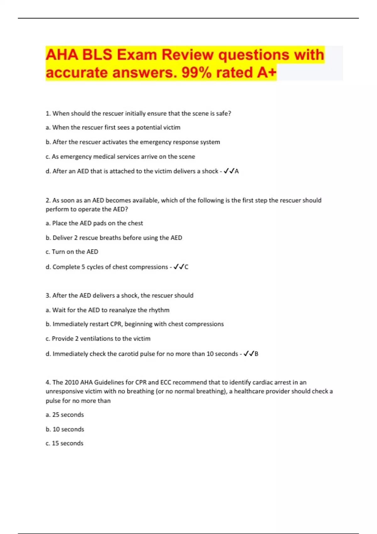 aha bls exam review questions with accurate answers 99 rated a document content and description below 1 when should the rescuer initially ensure that the scene is safe a when the rescuer first s