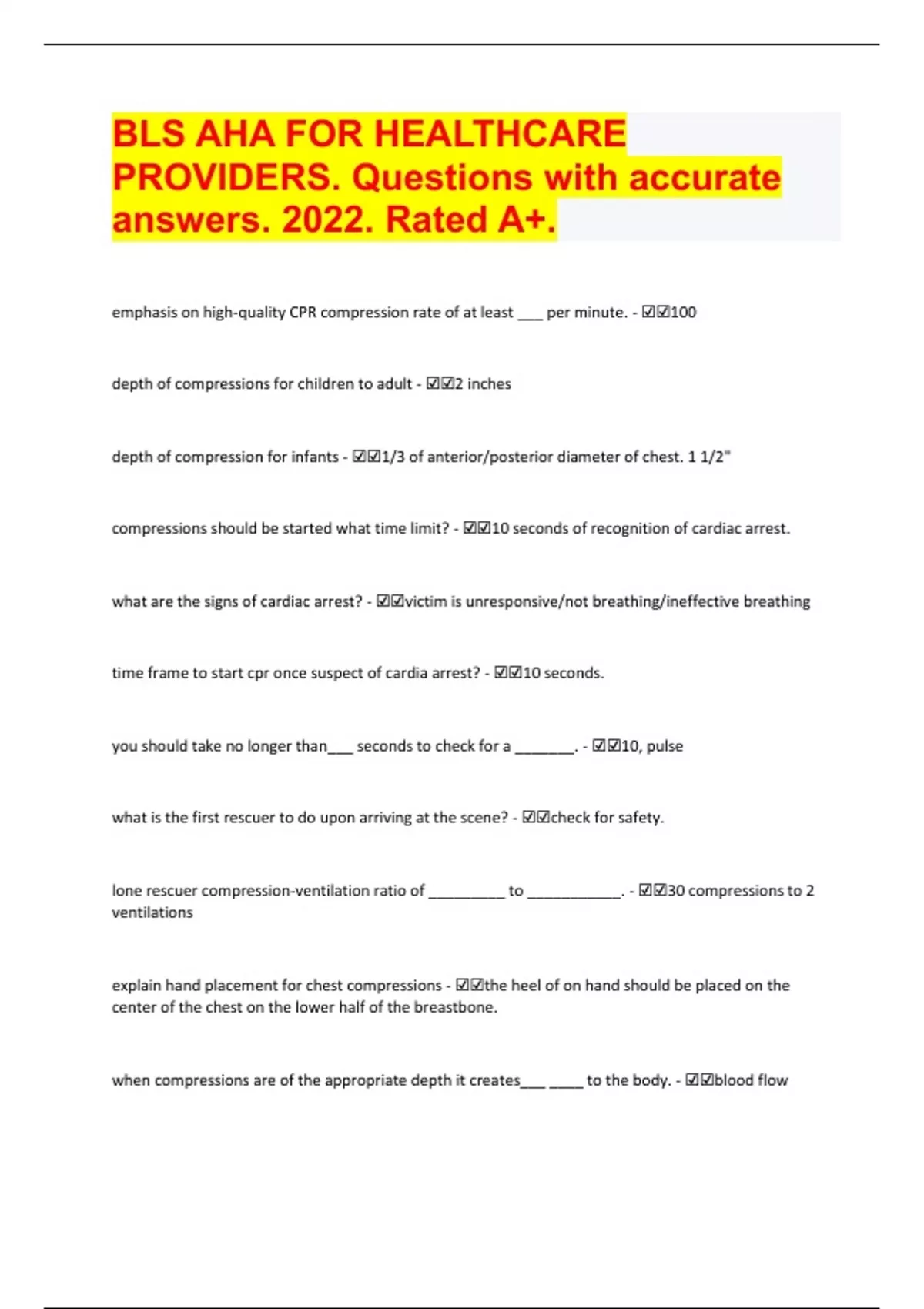 BLS AHA FOR HEALTHCARE PROVIDERS. Questions with accurate answers. 2022. Rated A+. Document Content and Description Below BLS AHA FOR HEALTHCARE PROVIDERS. Questions with accurate answers. 2022. Rated A+. emphasis on high-quality CPR compression rate of at least ___ per minute. - ☑☑100 depth of compressions for children to adult - ☑☑2 inches depth of compression for infants - ☑☑1/3 of anterior/posterior diameter of chest. 1 1/2" compressions should be started what time limit? - ☑☑10 seconds of recognition of cardiac arrest. what are the signs of cardiac arrest? - ☑☑victim is unresponsive/not breathing/ineffective breathing time frame to start cpr once suspect of cardia arrest? - ☑☑10 seconds. you should take no longer than___ seconds to check for a _______. - ☑☑10, pulse what is the first rescuer to do upon arriving at the scene? - ☑☑check for safety. lone rescuer compression-ventilation ratio of _________ to ___________. - ☑☑30 compressions to 2 ventilations explain hand placement for chest compressions - ☑☑the heel of on hand should be placed on the center of the chest on the lower half of the breastbone. when compressions are of the appropriate depth it creates___ ____ to the body. - ☑☑blood flow _____ allows the heart to refill with blood and is necessary for chest compressions to create blood flow - ☑☑chest recoil do not move the victim while CPR is in progress unless the victim is in a ________ ________. - ☑☑dangerous environment the ____ ______ ventilation technique is not recommended for a lone rescuer during CPR - ☑☑bag mask avoiding excessive ventilation also avoids _____ _____. - ☑☑gastric inflation during 2 rescuer adult CPR, rescuers switch duties after __ cycles. (or 2 minutes) - ☑☑5 the second rescuer's' job is to _________ an open airway and to five _____. - ☑☑maintain, breaths what is the first step when using an AED after the victim is secured? - ☑☑turn it on. the AED will _____ shock, charges itself, prompts that everyone is clear and prompts rescuers to press ___ _____ ____. - ☑☑advise, the shock button resucers immediately resume CPR with chest compression if ___ ___ _ ___ or after a shock is delivered. - ☑☑no shock is needed compression-to-breaths ratio for 2-rescuer child CPR is __ compression to __ breaths. - ☑☑15:2 compression to breath ratio for lone rescuer child CPR is __ compressions to __ breaths. - ☑☑30:2 an infant;s central pulse (located at the brachial artery) you must palpate the ___ of the upper arm between the ___ and the ____. - ☑☑inside, elbow, shoulder depth of compression for the infant is ___the depth of chest or ___ inches. or __cm. - ☑☑1/3, 1 1/2", or 4cm what compression technique should be used for 2 rescuer infant CPR? - ☑☑2 thumb compressions with hands encircling chest effective rescue breathing is assessed by - ☑☑watching the chest rise use an AED with adult pads for a child and infant if __ ___ ___ or ___ ____are available - ☑☑no child pads, pediatric atenuator when an advanced airway is in place the rescuers continue compressions at ___ per minute _____ pauses. breaths are given every ___ to ___ seconds or ___ to ___ breaths per minute. - ☑☑100,without. 6,8, 8,10 in order to five mouth to mouth breaths the rescuer should ___ airway, ___ mouth over victims mouth, ___ victims nose closed and delivers 2 breaths watching for the chest to ___. - ☑☑open, seal , pinch,rise when victim has a pulse but is no