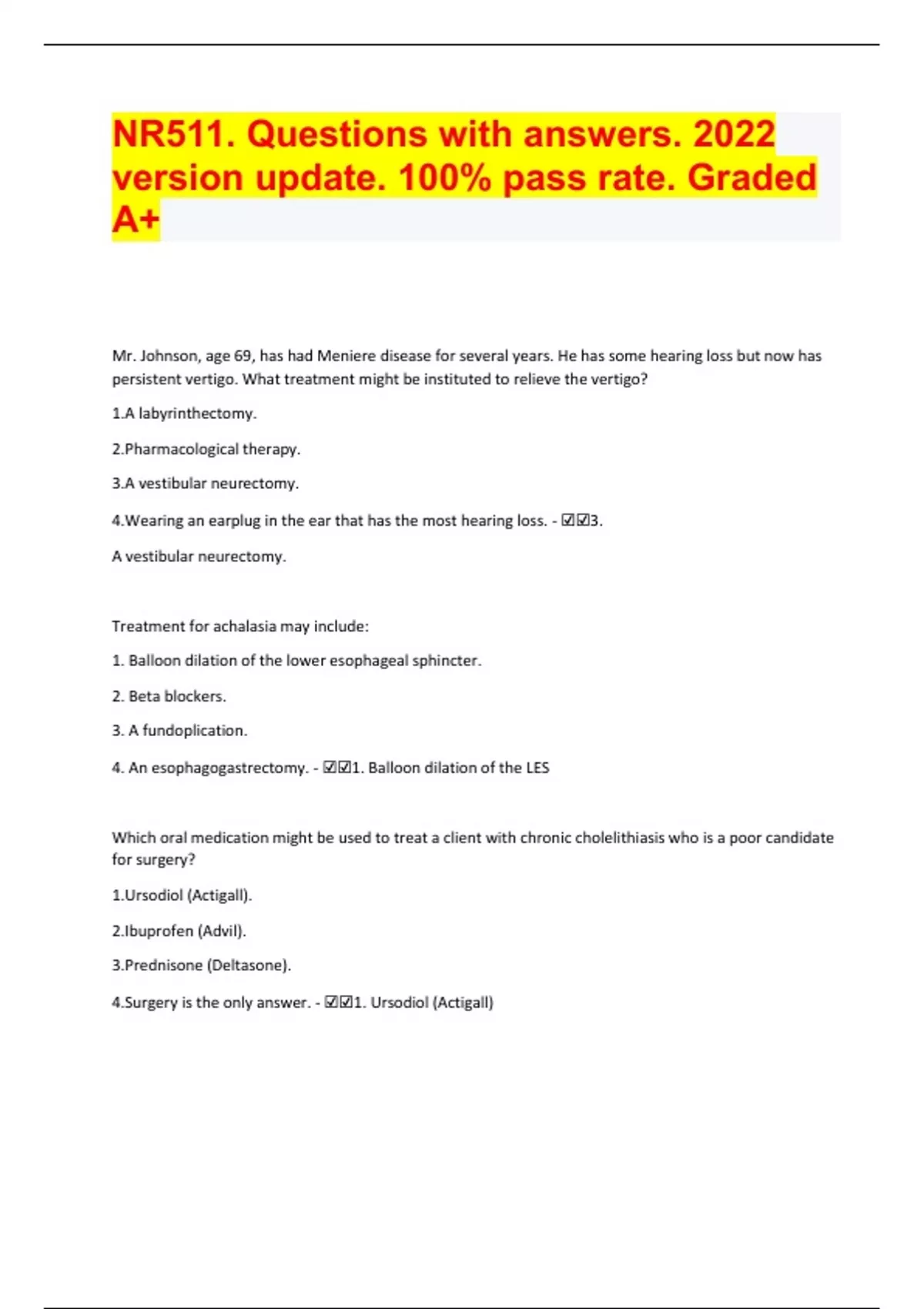 Document Content and Description Below NR511. Questions with answers. 2022 version update. 100% pass rate. Graded A+ Mr. Johnson, age 69, has had Meniere disease for several years. He has some hearing loss but now has persistent ver tigo. What treatment might be instituted to relieve the vertigo? 1.A labyrinthectomy. 2.Pharmacological therapy. 3.A vestibular neurectomy. 4.Wearing an earplug in the ear that has the most hearing loss. - ☑☑3. A vestibular neurectomy. Treatment for achalasia may include: 1. Balloon dilation of the lower esophageal sphincter. 2. Beta blockers. 3. A fundoplication. 4. An esophagogastrectomy. - ☑☑1. Balloon dilation of the LES Which oral medication might be used to treat a client with chronic cholelithiasis who is a poor candidate for surgery? 1.Ursodiol (Actigall). 2.Ibuprofen (Advil). 3.Prednisone (Deltasone). 4.Surgery is the only answer. - ☑☑1. Ursodiol (Actigall) All of the following medications are used for the control of nausea and vomiting. Which medication works by affecting the chemoreceptor trigger zone, thereby stimulating upper gastrointestinal motility and increasing lower esophageal sphincter pressure? 1.Anticholinergics, such as scopolamine (Donnatal). 2.Antidopaminergic agents, such as prochlorperazine (Compazine). 3.Antidopaminergic and cholinergic agents, such as metoclopramide (Reglan). 4.Tetrahydrocannabinols, such as dronabinol (Marinol). - ☑☑3.Antidopaminergic and cholinergic agents, such as metoclopramide (Reglan). You auscultate Julie's abdomen and hear a peritoneal friction rub. Which condition do you rule out? 1.Peritonitis. 2.A liver or spleen abscess. 3.A liver or spleen metastatic tumor. 4.Irritable bowel syndrome. - ☑☑4. IBS Which is the most common presenting symptom of gastric cancer? 1.Weight loss. 2.Dysphagia. 3.Hematemesis. 4.Gastrointestinal bleeding. - ☑☑1. Weight loss The metabolism of which drug is not affected in Marsha, age 74? 1.Alcohol. 2.Anticonvulsants. 3.Psychotropics. 4.Oral anticoagulants. - ☑☑1. Alcohol Nausea is difficult to discern in a young child. What question might you ask to determine if a child has nausea? 1."Are you sick to your tummy?" 2."Are you hungry?" 3."Are you eating the way you normally eat?" 4."Are you nauseous?" - ☑☑2. "Are you hungry?" Zena just had a hemorrhoidectomy. You know she has not understood your teaching when she tells you she will: 1.Take a sitz bath after each bowel movement for 1 to 2 weeks after surgery. 2.Drink at least 2000 mL of fluids per day. 3.Decrease her dietary fiber for 1 month. 4.Take stool softeners as prescribed. - ☑☑3.Decrease her dietary fiber for 1 month. Stacy, a nursing student, is to begin her series of hepatitis B vaccinations. You test her for a serological marker, and the results show hepatitis B surface antibodies (HBsAb). You tell Stacy that she: 1.Needs to begin the hepatitis B series as soon as possible. 2.Needs to be tested again because one reading is not indicative of immunity. 3.Is permanently immune to hepatitis B. 4.Has an acute hepatitis B infection. - ☑☑3. Is permanently immune to hepatitis B. Margie, age 52, has an extremely stressful job and was just given a diagnosis of gastric ulcer. She tells you she is sure it is going to be malignant. How do you respond? 1."Don't worry. Gastric ulcers are not cancerous." 2."About 95% of gastric ulcers are benign." 3."You have about a 50% chance of having gastric cancer from your ulcer." 4."Even if it is cancer, surgery is 100% successful." - ☑☑2."About 95% of gastric ulcers are benign." You are counseling Lillian, who is lactose intolerant, about foods to avoid. You know she misunderstands the teaching when she tells you she can have: 1.Yogurt. 2.Foods containing whey. 3.Prehydrolyzed milk. 4.Oranges. - ☑☑2.Foods containing whey. Susan, age 59, has no specific complaints when she comes in for her annual examination. She does, however, have type 2 diabetes mellitus (DM), slight hypertension, dyslipidemia, and central obesity. How would you diagnose her? 1.As a healthy adult with several problems. 2.As having a glycemic event. 3.As having metabolic syndrome. 4.As having multiple organ dysfunction - ☑☑3. As having metabolic syndrome. Tom has just been diagnosed with celiac disease. Which of the following might you tell him? 1.There is a new pharmaceutical cure for celiac disease. 2.A strict gluten-free diet is the only treatment for celiac disease. 3.Your children will not be at a higher risk for developing this disease. 4.The presence of celiac disease is decreasing dramatically in the United States. - ☑☑2.A strict gluten-free diet is the only treatment for celiac disease. Simon, age 72, states that he is worried because he has a bowel movement only every third day. You respond:1. "You should have two to three stools per day." 2."You should defecate once a day." 3."You should have at least three stools per week." 4."There is no such thing as a 'normal' pattern of defecation." - ☑☑4. "There is no such thing as a 'normal' pattern of defecation." Matt, age 26, recently returned from a camping trip and has gastroenteritis. He says that he has been eating only canned food. Which of the following pathogens do you suspect? 1.Campylobacter jejuni. 2.Clostridium botulinum. 3.Clostridium perfringens. 4.Staphylococcus. - ☑☑2. Clostridium botulinum. Timothy, age 68, complains of an abrupt change in his defecation pattern. You evaluate him for: 1.Constipation. 2.Colorectal cancer. 3.Irritable bowel syndrome. 4.Acute appendicitis. - ☑☑2. Colorectal cancer. Ruby has a colostomy and complains that her stools are too loose. What food(s) do you suggest to help thicken the stools? 1.Cheese. 2.Leafy green vegetables. 3.Raw fruits and vegetables. 4.Dried beans. - ☑☑1. Cheese Martina, age 34, has AIDS and currently suffers from diarrhea. You suspect she has which protozoal infection of the bowel? 1.Giardiasis. 2.Amebiasis. 3.Cryptosporidiosis. 4.Escherichia 