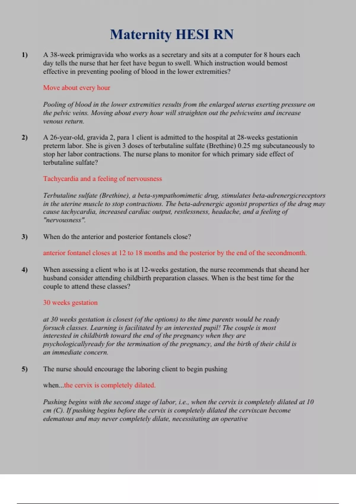 1) A 38-week primigravida who works as a secretary and sits at a computer for 8 hours each day tells the nurse that her feet have begun to swell. Which instruction would bemost effective in preventing pooling of blood in the lower extremities? Move about every hour Pooling of blood in the lower extremities results from the enlarged uterus exerting pressure on the pelvic veins. Moving about every hour will straighten out the pelvicveins and increase venous return. 2) A 26-year-old, gravida 2, para 1 client is admitted to the hospital at 28-weeks gestationin preterm labor. She is given 3 doses of terbutaline sulfate (Brethine) 0.25 mg subcutaneously to stop her labor contractions. The nurse plans to monitor for which primary side effect of terbutaline sulfate? Tachycardia and a feeling of nervousness Terbutaline sulfate (Brethine), a beta-sympathomimetic drug, stimulates beta-adrenergicreceptors in the uterine muscle to stop contractions. The beta-adrenergic agonist properties of the drug may cause tachycardia, increased cardiac output, restlessness, headache, and a feeling of "nervousness". 3) When do the anterior and posterior fontanels close? anterior fontanel closes at 12 to 18 months and the posterior by the end of the secondmonth. 4) When assessing a client who is at 12-weeks gestation, the nurse recommends that sheand her husband consider attending childbirth preparation classes. When is the best time for the couple to attend these classes? 30 weeks gestation