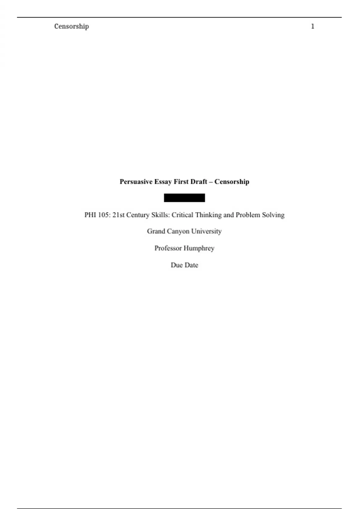 PHI 105 Topic 5 Assignment; Persuasive Essay First Draft; Censorship