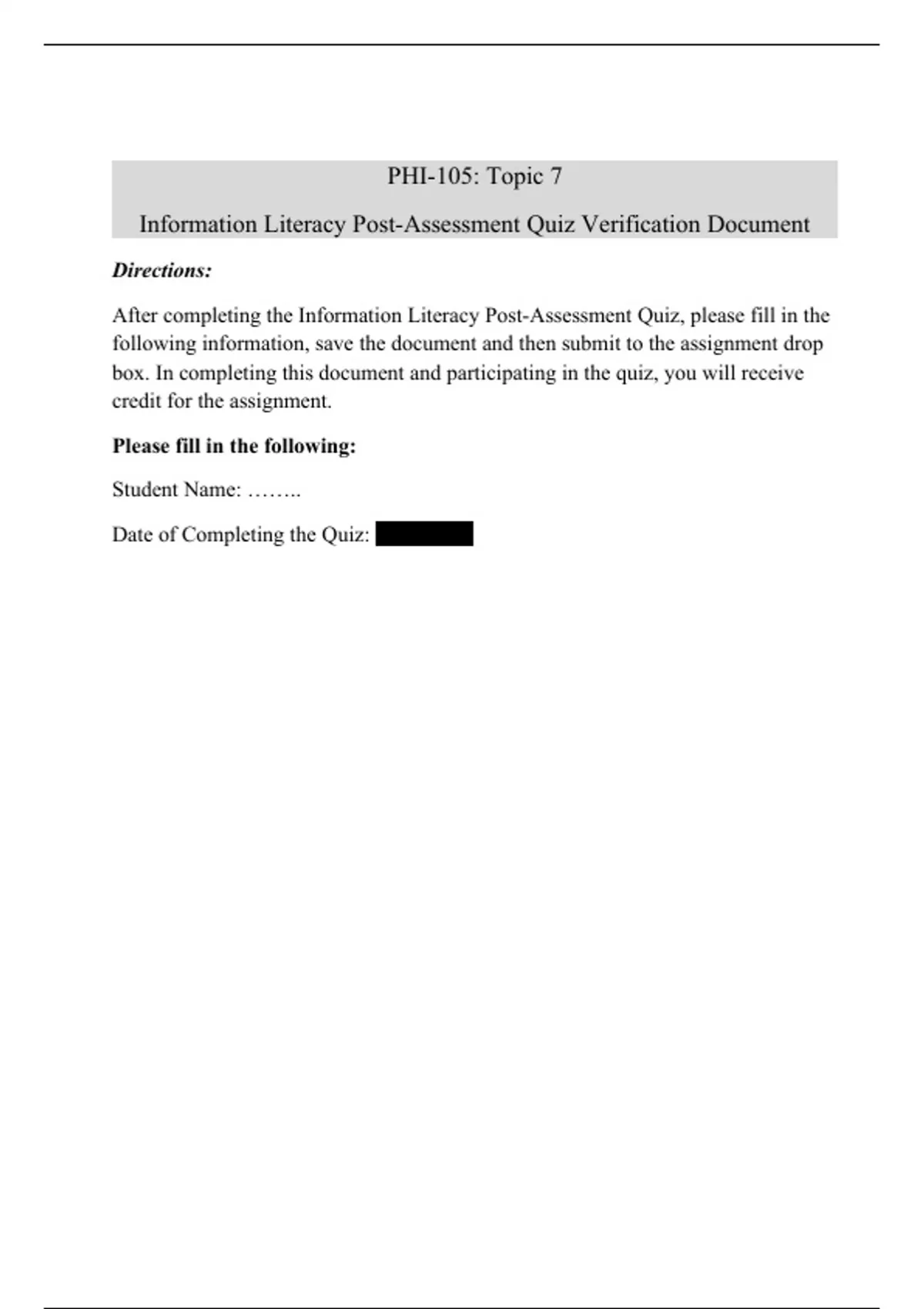 PHI 105 Topic 7 Assignment; Information Literacy Post-Assessment Quiz Verification Document
