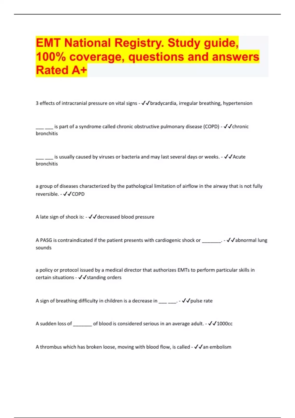 EMT National Registry. Study guide, 100% coverage, questions and answers Rated A+