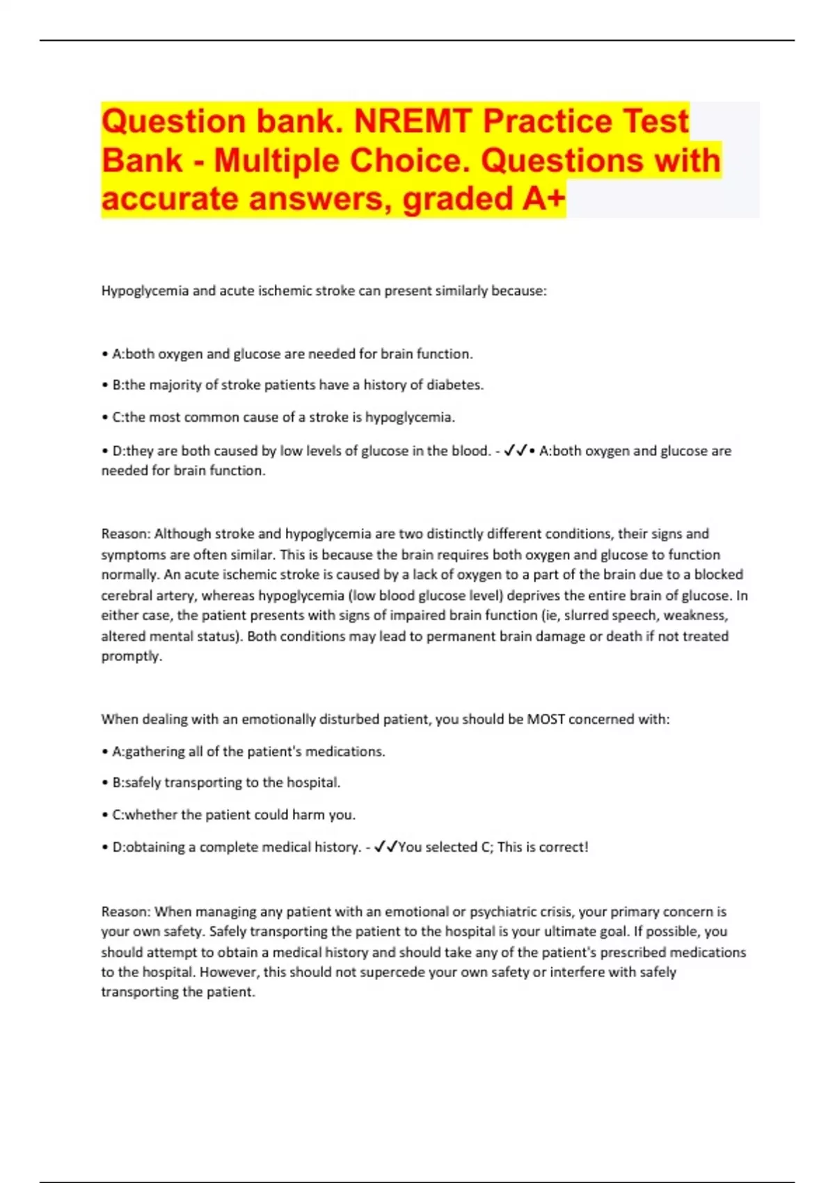 Question Bank. NREMT Practice Test Bank - Multiple Choice. Questions with accurate answers, graded A+ Document Content and Description Below Hypoglycemia and acute ischemic stroke can present similarly because: • A:both oxygen and glucose are needed for brain function. • B:the majority of stroke patients have a history of diabetes. • C:the most common cause of a stroke is hypoglycemia. • D:they are both caused by low levels of glucose in the blood. - • A:both oxygen and glucose are needed for brain function. Reason: Although stroke and hypoglycemia are two distinctly different conditions, their signs and symptoms are often similar. This is because the brain requires both oxygen and glucose to function normally. An acute ischemic stroke is caused by a lack of oxygen to a part of the brain due to a blocked cerebral artery, whereas hypoglycemia (low blood glucose level) deprives the entire brain of glucose. In either case, the patient presents with signs of impaired brain function (ie, slurred speech, weakness, altered mental status). Both conditions may lead to permanent brain damage or death if not treated promptly. When dealing with an emotionally disturbed patient, you should be MOST concerned with: • A:gathering all of the patient's medications. • B:safely transporting to the hospital. • C:whether the patient could harm you. • D:obtaining a complete medical history. - You selected C; This is correct! Reason: When managing any patient with an emotional or psychiatric crisis, your primary concern is your own safety. Safely transporting the patient to the hospital is your ultimate goal. If possible, you should attempt to obtain a medical history and should take any of the patient's prescribed medications to the hospital. However, this should not supercede your own safety or interfere with safely transporting the patient. You are at the scene where a man panicked while swimming in a small lake. Your initial attempt to rescue him should include: • A:rowing a small raft to the victim. • B:reaching for the victim with a long stick. • C:throwing a rope to the victim. • D:swimming to the victim to rescue him. - You selected B; This is correct! Reason: General rules to follow when attempting to rescue a patient from the water include "reach, throw, row, and then go." In this case, you should attempt to reach the victim by having him grab hold of a large stick or similar object. If this is unsuccessful, throw the victim a rope or flotation device (if available). If these are not available, row to the patient in a small raft (if available). Going into the water to retrieve the victim is a last resort. The rescuer must be a strong swimmer because patients who are in danger of drowning are in a state of blind panic and will make every attempt to keep themselves afloat, even if it means forcing the rescuer underwater. How should you classify a patient's nature of illness if he or she has a low blood glucose level, bizarre behavior, and shallow breathing? • A:Behavioral emergency • B:Altered mental status • C:Respiratory emergency • D:Cardiac compromise - The correct answer is B; Reason: The nature of illness (NOI) is the medical equivalent to mechanism of injury (MOI). Altered mental status should be the suspected NOI in any patient with any fluctuation in level of consciousness, which can range from bizarre behavior to complete unresponsiveness. Causes of an altered mental status include hypo- or hyperglycemia, head trauma, stroke, behavioral crises, drug overdose, and shock, among others. A young female is unresponsive after overdosing on an unknown type of drug. Her respirations are slow and shallow and her pulse is slow and weak. Which of the following drugs is the LEAST likely cause of her condition? • A:Seconal • B:Heroin • C:Cocaine • D:Valium - The correct answer is C; Reason: Of the drugs listed, cocaine would be the least likely cause of the patient's condition. Cocaine is a central nervous system (CNS) stimulant; you would expect her to be hypertensive, tachycardic, tachypneic, and perhaps even violent. Heroin, Valium, and Seconal are all CNS depressants and could explain her condition. Heroin is an illegal narcotic (opiate), Valium is a benzodiazepine sedative-hypnotic drug, and Seconal is a barbiturate. Narcotics, benzodiazepines, and barbiturates are all CNS depressants. When taken in excess, they cause a decreased level of consciousness, respiratory depression, bradycardia, and hypotension. Activated charcoal is contraindicated for a patient who is: • A:conscious and alert and has ingested a large amount of Motrin. • B:emotionally upset and has ingested two bottles of aspirin. • C:agitated and claims to have ingested a bottle of Tylenol. • D:awake and alert and has swallowed a commercial drain cleaner. - You selected D; This is correct! Reason:Activated charcoal adsorbs (sticks to) many ingested substances, preventing them from being absorbed into the body by the stomach or intestines. In some cases, you may give activated charcoal to patients who have ingested certain substances, if approved by medical control or local protocol. Activated charcoal is contraindicated for patients who have ingested an acid or alkali (ie, drain cleaner) or a petroleum product (ie, gasoline), who have a decreased level of consciousness and cannot protect their own airway, or who are unable to swallow. The MOST obvious way to reduce heat loss from radiation and convection is to: • A:move away from a cold object. • B:increase metabolism by shivering. • C:wear a thick wind-proof jacket. • D:move to a warmer environment. - you selected D; This is correct! Reason:In a cold environment, the body has two ways of staying warm: generating heat (thermogenesis) and reducing heat loss. Radiation is the transfer of heat by radiant energy. The body can lose heat by radiation, such as when a person stands in a cold room. Convection occurs when heat is transferred