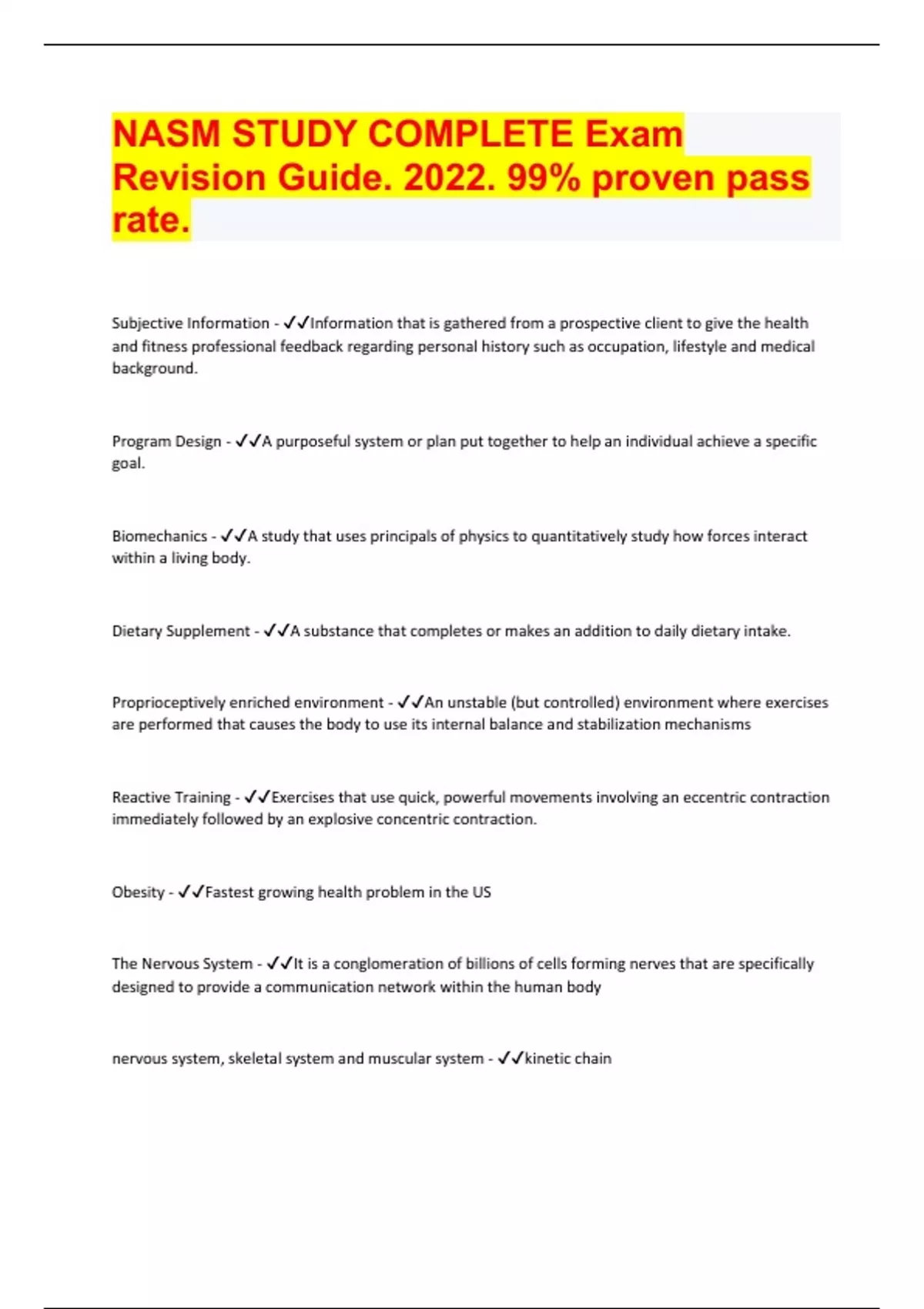 NASM STUDY COMPLETE Exam Revision Guide. 2022. 99% proven pass rate. Document Content and Description Below Subjective Information - Information that is gathered from a prospective client to give the health and fitness professional feedback regarding personal history such as occupation, lifestyle and medical background. Program Design - A purposeful system or plan put together to help an individual achieve a specific goal. Biomechanics - A study that uses principals of physics to quantitatively study how forces interact within a living body. Dietary Supplement - A substance that completes or makes an addition to daily dietary intake. Proprioceptively enriched environment - An unstable (but controlled) environment where exercises are performed that causes the body to use its internal balance and stabilization mechanisms Reactive Training - Exercises that use quick, powerful movements involving an eccentric contraction immediately followed by an explosive concentric contraction. Obesity - Fastest growing health problem in the US The Nervous System - It is a conglomeration of billions of cells forming nerves that are specifically designed to provide a communication network within the human body nervous system, skeletal system and muscular system - kinetic chain Heart - Muscular pump that rhythmically contracts to push blood throughout the body Dynamic Joint Stabilization - The ability of the kinetic chain to stabilize a joint during movement. Speed - The ability to move the body in one intended direction as fast as possible. The Core - The lumbo-pelvic -hip complex and the thoracic and cervical spine, where the body's center of gravity is located Flexibility - The normal extensibility of all soft tissues that allow the full range of motion of a joint. Nutrition - The sum of the processes by which an animal or plant takes in and uses food substances. Blood - Acts as a medium to deliver and collect essential products to and from the tissues of the body. Protein - Amino acids linked by peptide bonds. Diabetes - Chronic metabolic disorder, in which the body's ability to produce insulin or to utilize glucose is altered Rate of force production - How quickly a muscle can generate force Superior - Positioned above a point of reference. Dynamic Range of Motion - The combination of flexibility and the nervous system's ability to control this range efficiently. General Adaptation Syndrome - The kinetic chain's ability to adapt to stresses placed on it. Multisensory Condition - Training environment that provides heightened stimulation to proprioceptors and mechanoreceptors. Cardiorespiratory system - A system comprised of the cardiovascular and respiratory systems Rate of Force Production - Ability of muscles to exert maximal force output in a minimal amount of time. Acute Variables - Important components that specify how each exercise is to be performed. Inferior - Positioned below a point of reference. sensory function - The ability to sense changes in either external or internal environments Neromuscular efficiency - The ability of the neuromuscular system to allow agonists, antagonists, and stabilizers to work synergistically and control the entire kinetic chain in all three planes of motion Estimated Average Requirement (EAR) - The average daily nutrient intake level that is estimated to meet the requirement of half the healthy individuals who are in a particular life stage and gender group. Controlled Instability - Training environment that is unstable as can safely be controlled by an individual. Blood Vessel - A hollow tube that allows blood to be transported to and from the heart General Warm-Up - A low intensity exercise consisting of movements that do not necessarily relate to the more intense exercise that is to follow. Hypertension - blood pressure of 140/90 or higher integrative function - The ability to analyze and interpret sensory information to allow for proper decision making, which produces appropriate response Repetition (Rep) - One complete movement of a single exercise. Distal - Positioned farthest from the center of the body. Recommended Dietary Allowance (RDA) - The average daily nutrient intake level that is sufficient to meet the nutrient requirement of nearly all healthy individuals who are in a particular life stage and gender group. Extensibility - The capability to be elongated or stretched. Adequate Intake (AI) - A recommended average daily nutrient intake level, based on observed approximations or estimates of nutrient intake that are assumed to be adequate for a group of healthy people. This measure is used when an RDA cannot be determined. Deconditioned - A state of lost physical fitness, which may include muscle imbalances, decreased flexibility, and/or a lack of core and joint stability Specific Warm-Up - Low intensity exercise consisting of movements that mimic those that will be included in the more intense exercise that is to follow Mediastinum - The space in the chest between the lungs that contains all the internal organs of the chest, except the lungs. Motor function - Neuromuscular response to sensory information Dynamic Functional Flexibili