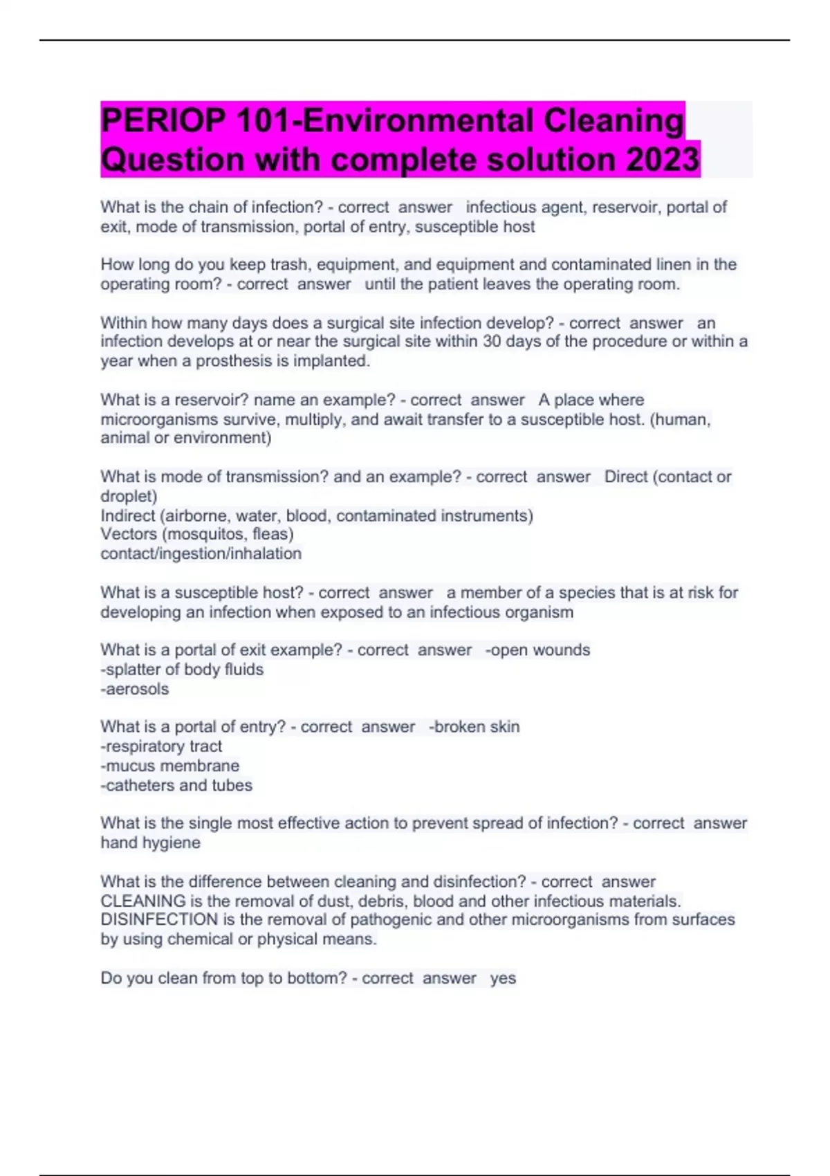 PERIOP 101-Environmental Cleaning Question with complete solution 2023What is the chain of infection? infectious agent, reservoir, portal of exit, mode of transmission, portal of entry, susceptible host How long do you keep trash, equipment, and equipment and contaminated linen in the operating room? until the patient leaves the operating room. Within how many days does a surgical site infection develop? an infection develops at or near the surgical site within 30 days of the procedure or within a year when a prosthesis is implanted. What is a reservoir? name an example? A place where microorganisms survive, multiply, and await transfer to a susceptible host. (human, animal or environment) What is mode of transmission? and an example? Direct (contact or droplet) Indirect (airborne, water, blood, contaminated instruments) Vectors (mosquitos, fleas) contact/ingestion/inhalation What is a susceptible host? a member of a species that is at risk for developing an infection when exposed to an infectious organism What is a portal of exit example? -open wounds -splatter of body fluids -aerosols What is a portal of entry? -broken skin -respiratory tract -mucus membrane -catheters and tubes What is the single most effective action to prevent spread of infection? hand hygiene What is the difference between cleaning and disinfection? CLEANING is the removal of dust, debris, blood and other infectious materials. DISINFECTION is the removal of pathogenic and other microorganisms from surfaces by using chemical or physical means. Do you clean from top to bottom? yes Do you clean from less soiled to dirtiest areas? yes Do not use spray bottles to apply cleaning agents in the perioperative environment. TRUE OR FALSE TRUE After procedures performed on patient with known or suspected airborne transmissible diseases (TB, chicken pox, measles), the OR must be empty for a designated amount of time for the airborne particulars to be filtered before environmental cleaning begins. TRUE OR FALSE TRUE