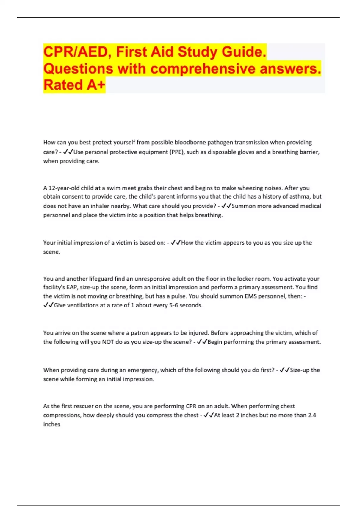 CPR/AED, First Aid Study Guide. Questions with comprehensive answers. Rated A+ Document Content and Description Below How can you best protect yourself from possible bloodborne pathogen transmission when providing care? - Use personal protective equipment (PPE), such as disposable gloves and a breathing barrier , when providing care. A 12-year-old child at a swim meet grabs their chest and begins to make wheezing noises. After you obtain consent to provide care, the child's parent informs you that the child has a history of asthma, but does not have an inhaler nearby. What care should you provide? - Summon more advanced medical personnel and place the victim into a position that helps breathing. Your initial impression of a victim is based on: - How the victim appears to you as you size up the scene. You and another lifeguard find an unresponsive adult on the floor in the locker room. You activate your facility's EAP, size-up the scene, form an initial impression and perform a primary assessment. You find the victim is not moving or breathing, but has a pulse. You should summon EMS personnel, then: - Give ventilations at a rate of 1 about every 5-6 seconds. You arrive on the scene where a patron appears to be injured. Before approaching the victim, which of the following will you NOT do as you size-up the scene? - Begin performing the primary assessment. When providing care during an emergency, which of the following should you do first? - Size-up the scene while forming an initial impression. As the first rescuer on the scene, you are performing CPR on an adult. When performing chest compressions, how deeply should you compress the chest - At least 2 inches but no more than 2.4 inches CPR should be performed on which of the following victims? - One who is in cardiac arrest What is the first step of the Adult Cardiac Chain of Survival? - Recognition of a cardiac emergency and activation of the emergency response system. You are providing care to a victim suspected of having a heart attack. Which of the following would you do first? - Summon EMS personnel. Once you have turned on the automated external defibrillator (AED), you should: - Apply the pads and allow the AED to analyze the heart rhythm. To ensure high-quality CPR and high-quality chest compressions, you should: - Expose the victim's chest to ensure proper hand placement and full chest recoil. You are performing CPR on a victim and an assisting responder arrives. Which of the following is most appropriate for the assisting responder to do first? - Check to see whether EMS personnel have been called. Which of the following is most essential to use when giving ventilations to protect you and the victim from disease transmission? - Resuscitation masks You are providing care to a facility maintenance worker who has fallen off the top of a ladder. The victim is responsive. Which of the following should you do first? - Obtain consent from the victim to provide care. For which of the following should you summon EMS personnel? - A victim with an open leg wound with the bone protruding While performing a primary assessment on an unresponsive adult who has been rescued from the water, you find that they have only occasional gasps, no pulse and no severe li
