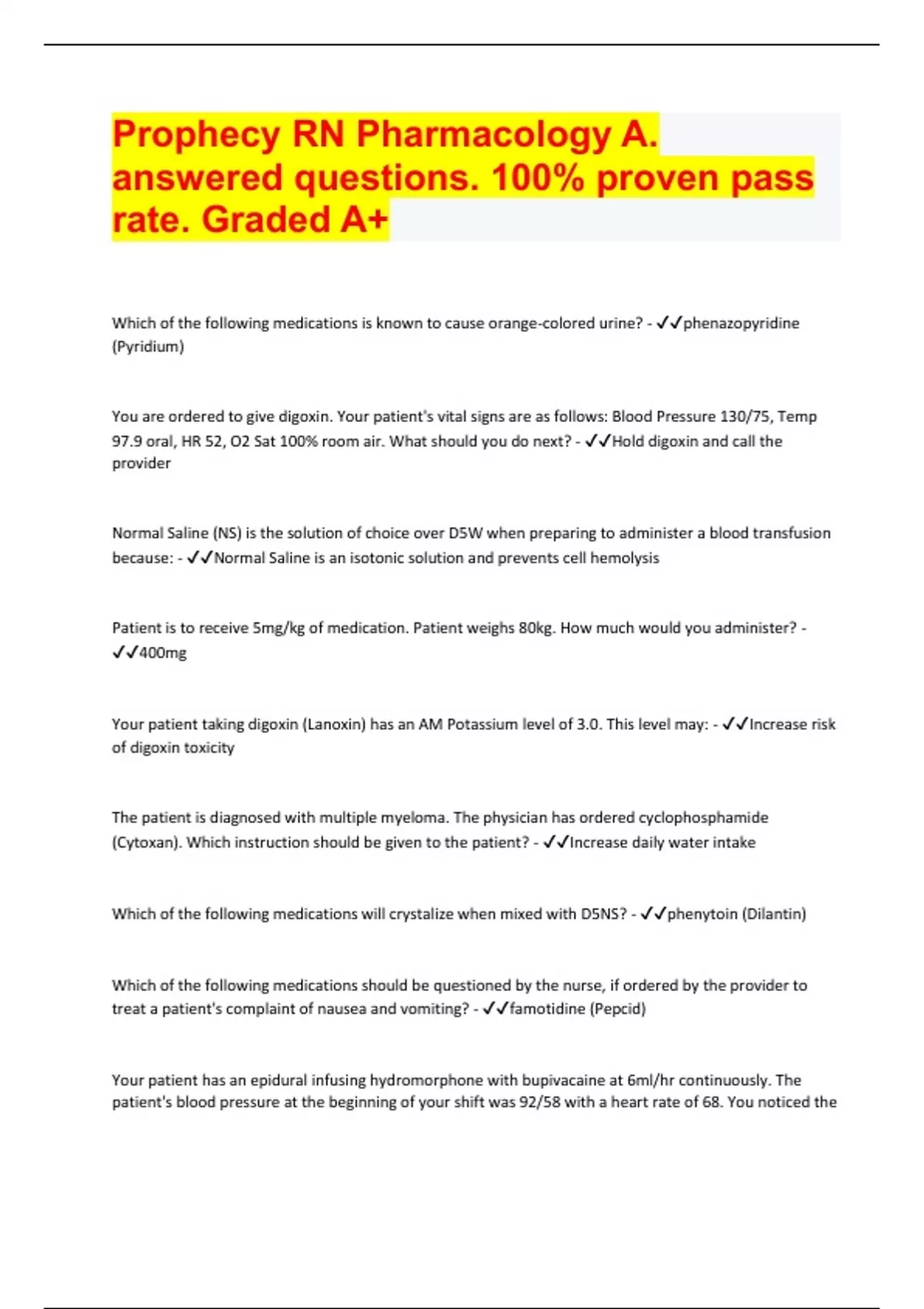 Prophecy RN Pharmacology A. answered questions. 100% proven pass rate. Graded A+ Document Content and Description Below Which of the following medications is known to cause orange-colored urine? - phenazopyridine (Pyridium) You are ordered to give digoxin. Your patient's vital signs are as follows: Blood Press ure 130/75, Temp 97.9 oral, HR 52, O2 Sat 100% room air. What should you do next? - Hold digoxin and call the provider Normal Saline (NS) is the solution of choice over D5W when preparing to administer a blood transfusion because: - Normal Saline is an isotonic solution and prevents cell hemolysis Patient is to receive 5mg/kg of medication. Patient weighs 80kg. How much would you administer? - 400mg Your patient taking digoxin (Lanoxin) has an AM Potassium level of 3.0. This level may: - Increase risk of digoxin toxicity The patient is diagnosed with multiple myeloma. The physician has ordered cyclophosphamide (Cytoxan). Which instruction should be given to the patient? - Increase daily water intake Which of the following medications will crystalize when mixed with D5NS? - phenytoin (Dilantin) Which of the following medications should be questioned by the nurse, if ordered by the provider to treat a patient's complaint of nausea and vomiting? - famotidine (Pepcid) Your patient has an epidural infusing hydromorphone with bupivacaine at 6ml/hr continuously. The patient's blood pressure at the beginning of your shift was 92/58 with a heart rate of 68. You noticed the patient's blood pressures have been around 130/70. What should you do FIRST? - Check infusion rate to confirm 6ml/hr, then notify anesthesia provider The dosage of which drug must be tapered off slowly to prevent acute adrenal insufficiency? - prednisone (Deltasone) When teaching a new nurse on how to administer IV push furosemide (Lasix), you emphasize that it should be given over two minutes to avoid: - tinnitus A nurse is caring for a patient with hyperparathyroidism and notes that the patient's serum calcium level is 13mg/dl. Which medication should the nurse prepare to administer as prescribed to the patient? - calcintonin (Miacalcin) S
