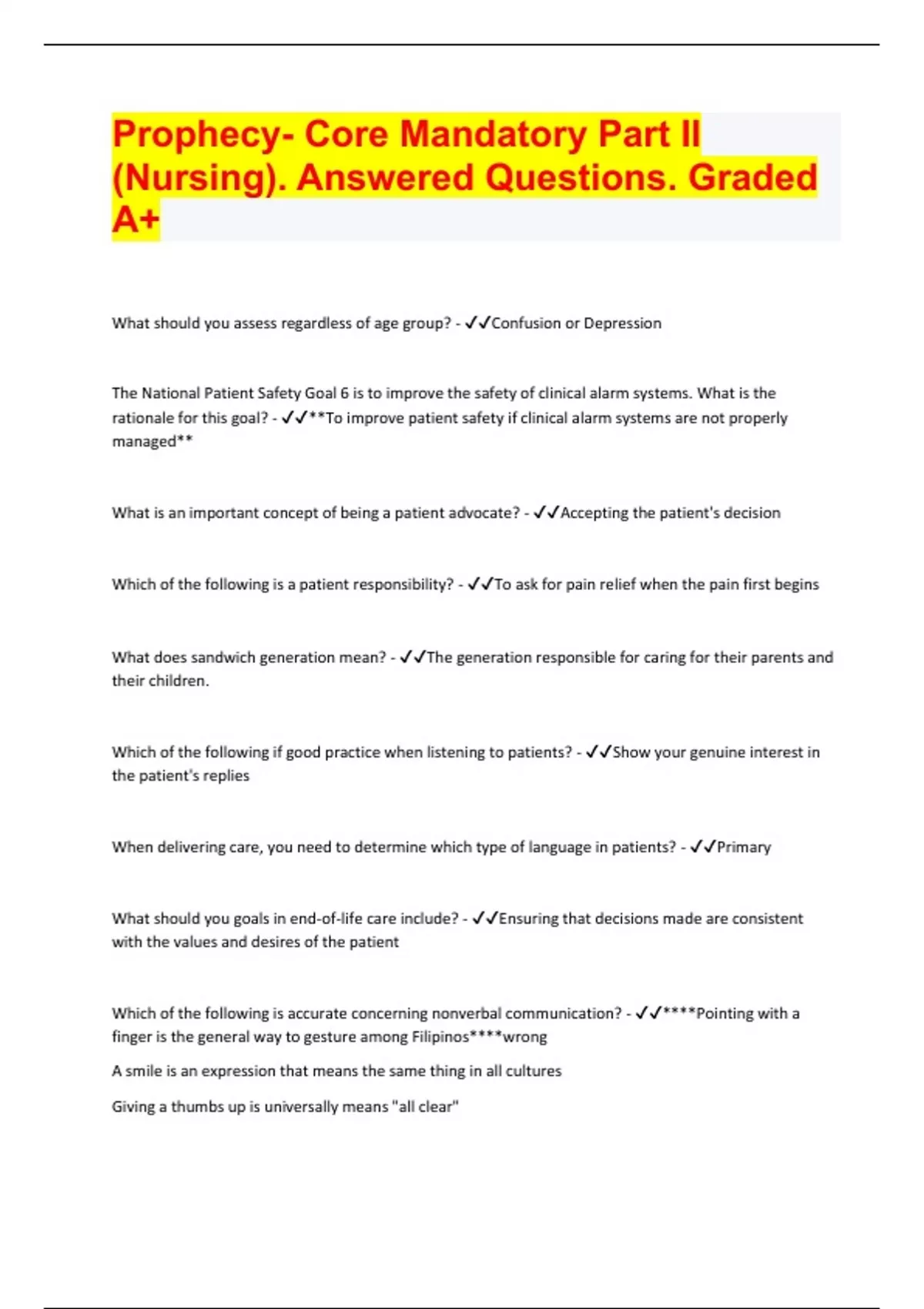 Prophecy- Core Mandatory Part II (Nursing). Answered Questions. Graded A+ Document Content and Description Below What should you assess regardless of age group? - Confusion or Depression The National Patient Safety Goal 6 is to improve the safety of clinical alarm systems. What is the rationale for this goal? - **To improve patient safety if clinical alarm systems are not properly managed** What is an important concept of being a patient advocate? - Accepting the patient's decision Which of the following is a patient responsibility? - To ask for pain relief when the pain first begins What does sandwich generation mean? - The generation responsible for caring for their parents and their children. Which of the following if good practice when listening to patients? - Show your genuine interest in the patient's replies When delivering care, you need to determine which type of language in patients? - Primary What should you goals in end-of-life care include? - Ensuring that decisions made are consistent with the values and desires of the patient Which of the following is accurate concerning nonverbal communication? - ****Pointing with a finger is the general way to gesture among Filipinos****wrong A smile is an expression that means the same thing in all cultures Giving a thumbs up is universally means "all clear" Touching another persons head is considered offensive in some cultures. Which of the following is an ethical dilemma? - A medical device company buying a trip to New York City for a physician, as a thank you for using their device during a recent surgery What is the intention of the Universal Protocol? - Prevent wrong site, wrong procedure, wrong person surgery According to the National Patient Goals, which type of therapy poses a risk to patients due to its complex dosing - Anticoagulation therapy What does a comprehensive systematic analysis following a sentinel event help identify? - The contributory factors associated with the event Which of the following is accurate concerning patient rights? - Health information must be provided in a language that patients understand Which of the following is important to remember when providing care to adults ages 80 and older? - There is no reason to assume mental decline has occurred Which example qualifies as a sentinel event that would require review by the Joint Commission? - A patient who commits suicide within 72 hours of being discharged from a hospital setting that provides staffed, around the clock care What is a sentinel event? - an event that affects a patient causing death, harm, or intervention required to sustain life According to the National Patient Safety Goals, one of the most important ways to address healthcare associated infections is by doing which of the following - Improving hand hygiene of healthcare staff Which of the following is an essential component of cultural competence for healthcare workers according to the Joint Commission - Valuing Diversity What is an example of patient's rights? - Patients are entitled to refuse