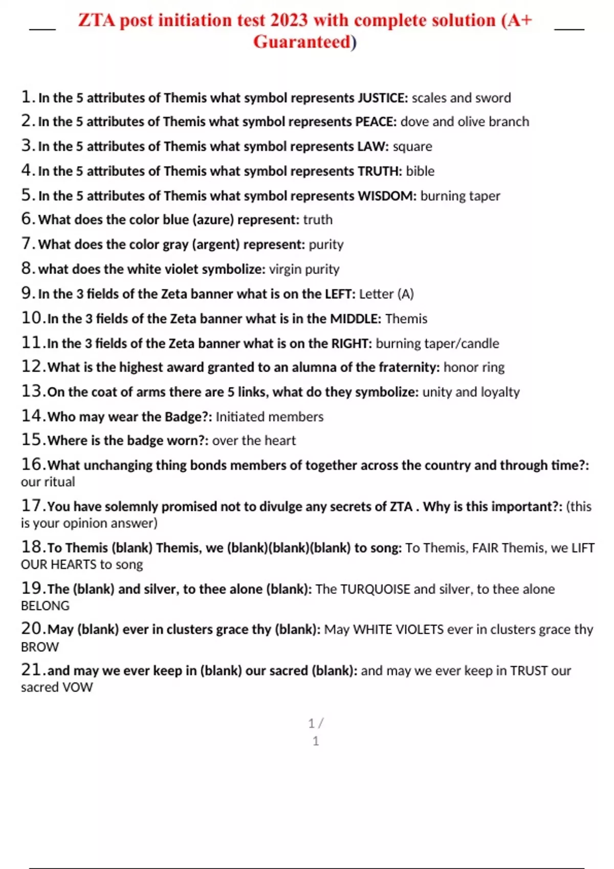 1. In the 5 attributes of Themis what symbol represents JUSTICE: scales and sword 2. In the 5 attributes of Themis what symbol represents PEACE: dove and olive branch 3. In the 5 attributes of Themis what symbol represents LAW: square 4. In the 5 attributes of Themis what symbol represents TRUTH: bible 5. In the 5 attributes of Themis what symbol represents WISDOM: burning taper 6. What does the color blue (azure) represent: truth