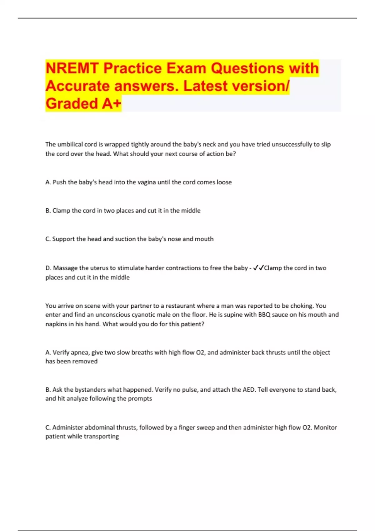 nremt practice exam questions with accurate answers latest version graded a document content and description below the umbilical cord is wrapped tightly around the babys neck and you have tried