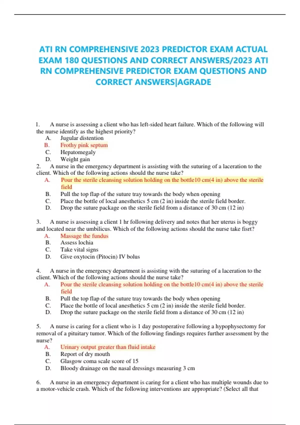 ATI RN COMPREHENSIVE 2023 PREDICTOR EXAM ACTUAL EXAM 180 QUESTIONS AND CORRECT ANSWERS/2023 ATI RN COMPREHENSIVE PREDICTOR EXAM QUESTIONS AND CORRECT ANSWERS|AGRADE