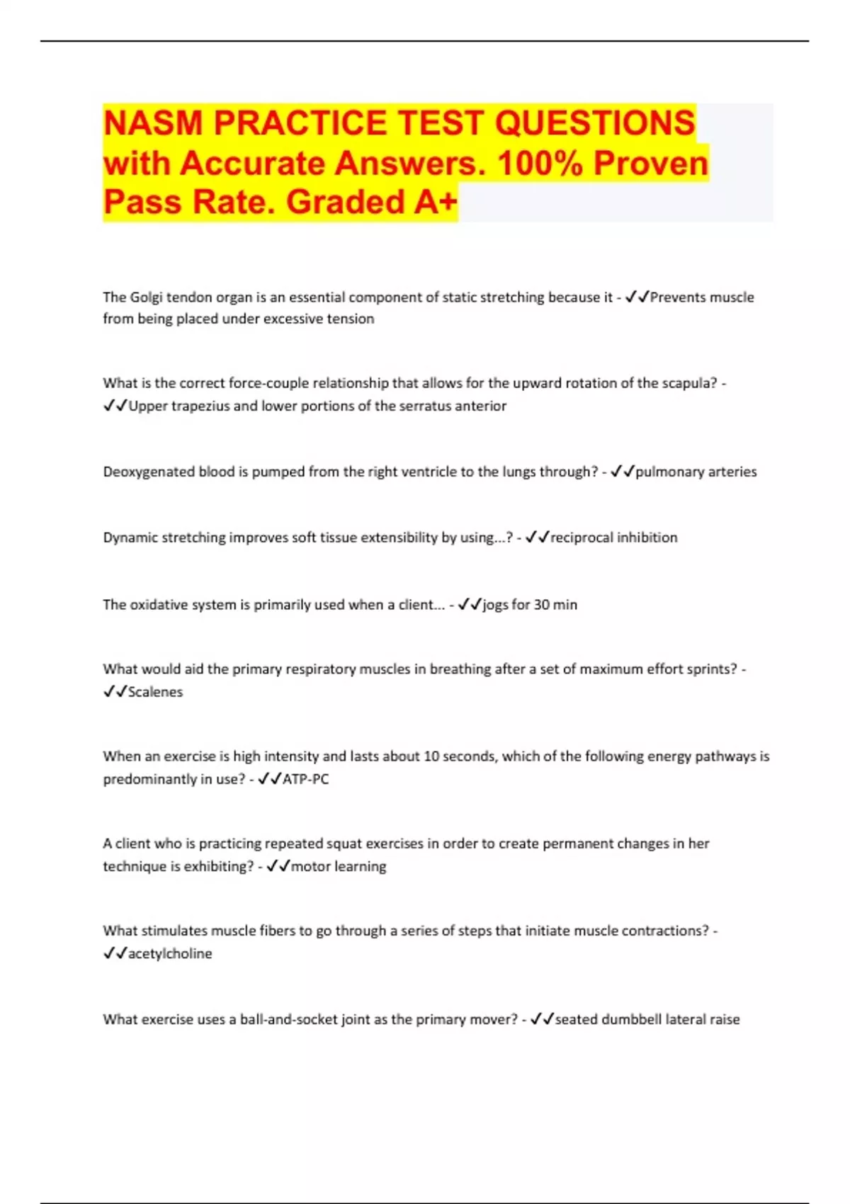 nasm practice test questions with accurate answers 100 proven pass rate graded a document content and description below the golgi tendon organ is an essential component of static stretching becaus