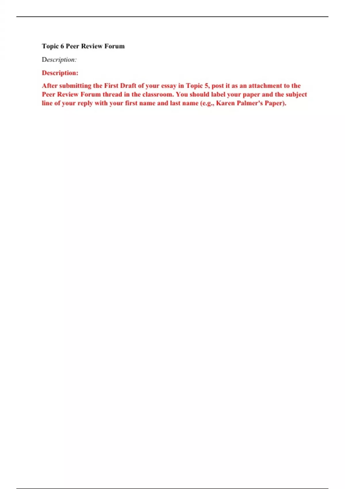 Topic 6 Peer Review Forum Description: Description: After submitting the First Draft of your essay in Topic 5, post it as an attachment to the Peer Review Forum thread in theclassroom. You should label your paper and the subject line of your reply with your first name and last name (e.g., KarenPalmer's Paper).