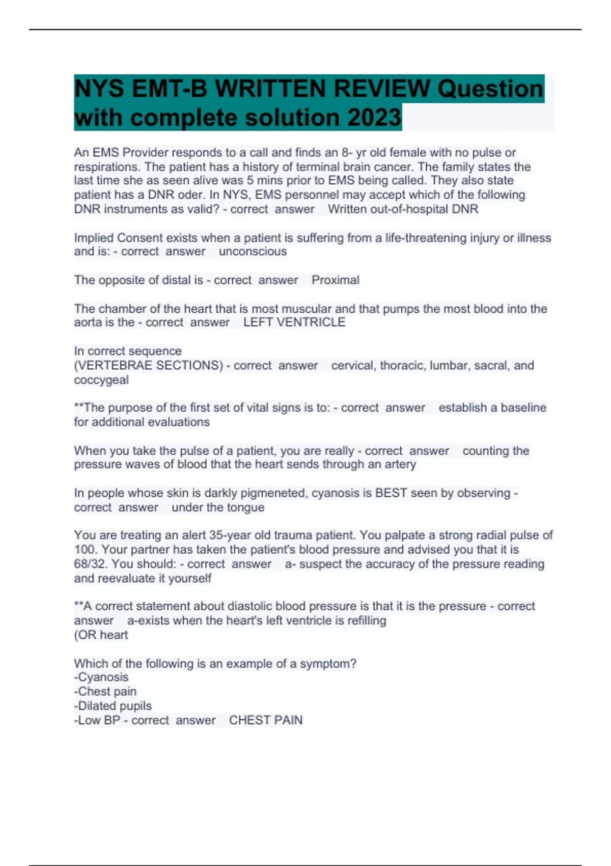 NYS EMT-B WRITTEN REVIEW Question with complete solution 2023An EMS Provider responds to a call and finds an 8- yr old female with no pulse or respirations. The patient has a history of terminal brain cancer. The family states the last time she as seen alive was 5 mins prior to EMS being called. They also state patient has a DNR oder. In NYS, EMS personnel may accept which of the following DNR instruments as valid? Written out-of-hospital DNR Implied Consent exists when a patient is suffering from a life-threatening injury or illness and is: unconscious The opposite of distal is Proximal The chamber of the heart that is most muscular and that pumps the most blood into the aorta is the LEFT VENTRICLE In correct sequence (VERTEBRAE SECTIONS) cervical, thoracic, lumbar, sacral, and coccygeal **The purpose of the first set of vital signs is to: establish a baseline for additional evaluations When you take the pulse of a patient, you are really counting the pressure waves of blood that the heart sends through an artery In people whose skin is darkly pigmeneted, cyanosis is BEST seen by observing under the tongue You are treating an alert 35-year old trauma patient. You palpate a strong radial pulse of 100. Your partner has taken the patient's blood pressure and advised you that it is 68/32. You should: a- suspect the accuracy of the pressure reading and reevaluate it yourself **A correct statement about diastolic blood pressure is that it is the pressure a-exists when the heart's left ventricle is refilling (OR heart Which of the following is an example of a symptom? -Cyanosis -Chest pain -Dilated pupils -Low BP CHEST PAIN For a patient with a suspected lumbar spinal injury, the BEST device for moving the patient as a single unit over uneven terrain is the: -wheeled stretcher -long spine board -flexible stretcher -short spine board *fleixble stretcher? Which of the following is the best indicator of the quality of ventilations -chest expansion -pupil size -blood pressure -skin color CHEST EXPANSION Unless additional suctioning time is necessary to clear the airway, an adult patient should be suctioned for NO LONGER THAN 15 seconds **During single-rescuer CPR, which of the following ventilation devices would be MOST effective for ventilating a patient - NRB - Pocket mask w/ oxygen - Flow-restricted, oxygen-powered ventilation device (FROPVD) - BVM w/o oxygen BVM w/o oxygen **While performing ventilations on an infant or child in respiratory arrest, you should ventilate every 3-5 seconds **The oropharyngeal airway will help keep the tongue away from the epiglottis You are called to the home of a patient who is on physician prescribed low-concentration oxygen and who is NOT in acute respiratory distress. Which type of oxygen delivery device should you use during transport? - NRB - Flow-restricted, oxygen-powered ventilation device (FROPVD) - BVM w/ supplemental oxgyen - Nasal cannula Non-rebreathing mask **An EMS provider is treating a patient who has a head injury resulting from a blow by a baseball bat. What other problem are likely to be present? - Hypothermia - Hypertensive shock due to blood loss - Spinal injuries - Lung collapse Spinal injuries