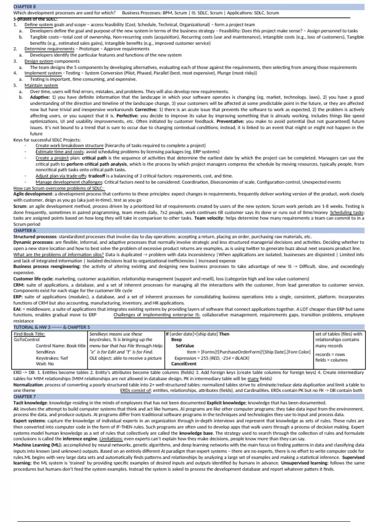 Covers chapter 5-9 and tutorial & homework 3. Used for final exam, 1 page (front and back)