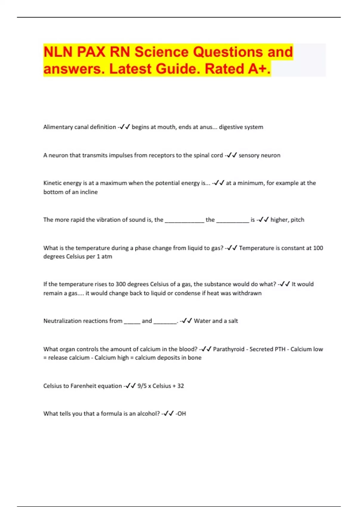 NLN PAX RN Science Questions and answers. Latest Guide. Rated A+. Document Content and Description Below Alimentary canal definition - begins at mouth, ends at anus... digestive system A neuron that transmits impulses from receptors to the spinal cord - sensory neuron Kinetic energy is at a maximum when the potential energy is... - at a minimum, for example at the bottom of an incline The more rapid the vibration of sound is, the ____________ the __________ is - higher, pitch What is the temperature during a phase change from liquid to gas? - Temperature is constant at 100 degrees Celsius per 1 atm If the temperature rises to 300 degrees Celsius of a gas, the substance would do what? - It would remain a gas.... it would change back to liquid or condense if heat was withdrawn Neutralization reactions from _____ and _______. - Water and a salt What organ controls the amount of calcium in the blood? - Parathyroid - Secreted PTH - Calcium low = release calcium - Calcium high = calcium deposits in bone Celsius to Farenheit equation - 9/5 x Celsius + 32 What tells you that a formula is an alcohol? - -OH If a car's rate of change of velocity is negative, the car is ________. - Slowing down What type of solution is an alkaline solution? - Basic What type of facilitation is needed to go down a concentration gradient? - Active transport Which of these biological processes includes the other 3? a) cell respiration b) Krebs cycle c) ETC d) anaerobic splitting of glucose - Cell respiration - Cell resp begins with splitting glucose. Products enter Krebs cycle and then ETC In the classification of 2 organisms, which of the following is the best evidence of a close relationship? a) # and arrangement of bones b) similar sequence of AA and proteins c) similar methods of sexual reproduction d) similar methods of cell respiration - b) similar sequence of AA and proteins Bending of light - Refraction What makes up proteins? - Amino Acids Einsteins equation E=mc^2.... what does c represent? - c = speed of light More energy is used pushing an object up an inclined plane than lifting the box straight up. Why is this? - work is done against friction in pushing the box. Energy goes into counteracting friction Tip of crest to tip of crest in a wave is called - wavelength Most of the work done by the human kidney occurs in the - nephron Where is food stored in a growing embryo of a bean seed? - The endosperm... large area inside the embryo In NaCl(aq), the solvent is __________. - Water. Because (aq) implies that NaCl will be put into water What turns starch blue-black? - Lugol's solution Ohm's law is the study of ___________. - Electricity What temperature cannot occur? - Anything below 0 Kelvin What organisms are Protists? - fungi, ferns, mollusks What is a half life? - One half life is the amount of time it takes for one half of the mass of a sample of radioactive substance to decay. Ex) Half life is 20 years for 12g. in 20 years.... 12/2 = 6g... in 40 years..... 6/2=3g Isotopes contain a different number of __________. But they have the same atomic number. - Neutrons What makes up the atomic mass? - Protons and Neutrons What makes up the atomic number? - Protons and Electrons If you chew a bland cracker slowly, what will it fast like? And why? - Sweet because the enzyme amylase breaks down starches to sugars A compound that acts l