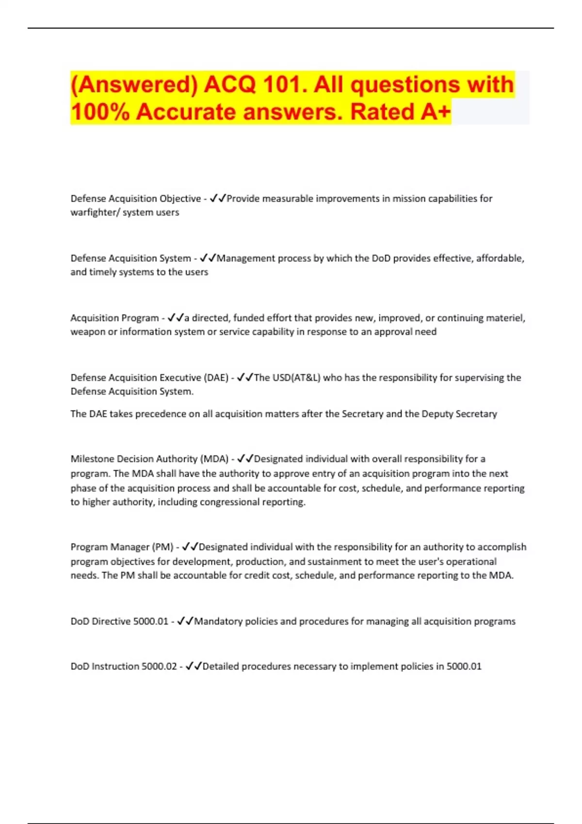 answered acq 101 all questions with 100 accurate answers rated a document content and description below defense acquisition objective provide measurable improvements in mission capabilities fo