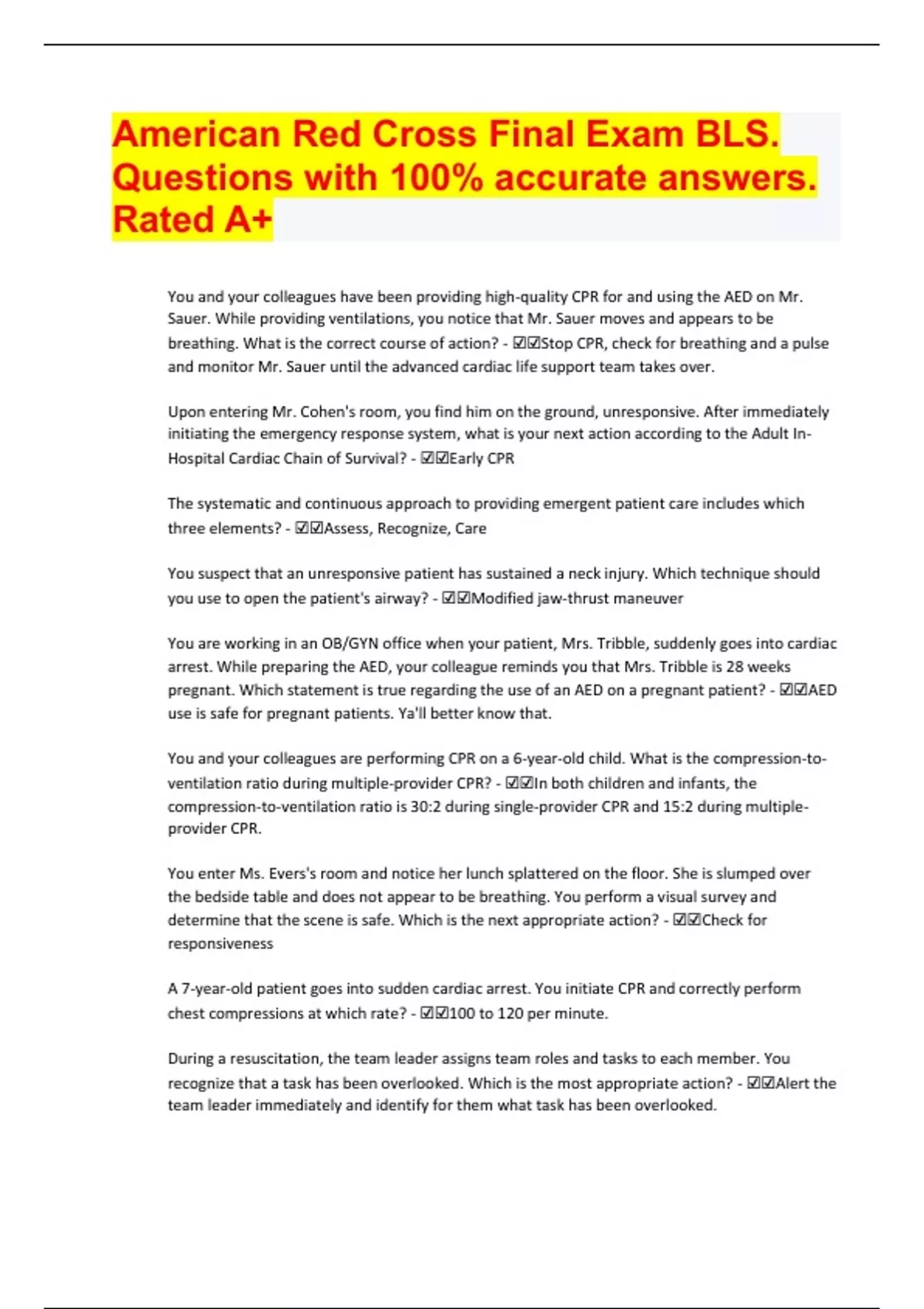 american red cross final exam bls questions with 100 accurate answers rated a document content and description below you and your colleagues have been providing high quality cpr for and using the