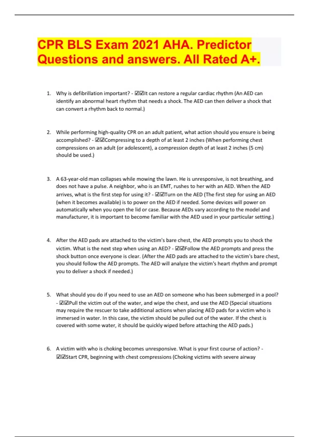 CPR BLS Exam 2021 AHA. Predictor Questions and answers. All Rated A+. Document Content and Description Below 1. Why is defibrillation important? - ☑☑It can restore a regular cardiac rhythm (An AED can identify an abnormal heart rhythm that needs a shock. The AED can then deliver a shock that can convert a rhythm back to normal.) 2. While performing high-quality CPR on an adult patient, what action should you ensure is being accomplished? - ☑☑Compressing to a depth of at least 2 inches (When performing chest compressions on an adult (or adolescent), a compression depth of at least 2 inches (5 cm) should be used.) 3. A 63-year-old man collapses while mowing the lawn. He is unresponsive, is not breathing, and does not have a pulse. A neighbor, who is an EMT, rushes to her with an AED. When the AED arrives, what is the first step for using it? - ☑☑Turn on the AED (The first step for using an AED (when it becomes available) is to power on the AED if needed. Some devices will power on automatically when you open the lid or case. Because AEDs vary according to the model and manufacturer, it is important to become familiar with the AED used in your particular setting.) 4. After the AED pads are attached to the victim's bare chest, the AED prompts you to shock the victim. What is the next step when using an AED? - ☑☑Follow the AED prompts and press the shock button once everyone is clear. (After the AED pads are attached to the victim's bare chest, you should follow the AED prompts. The AED will analyze the victim's heart rhythm and prompt you to deliver a shock if needed.) 5. What should you do if you need to use an AED on someone who has been submerged in a pool? - ☑☑Pull the victim out of the water, and wipe the chest, and use the AED (Special situations may require the rescuer to take additional actions when placing AED pads for a victim who is immersed in water. In this case, the victim should be pulled out of the water. If the chest is covered with some water, it should be quickly wiped before attaching the AED pads.) 6. A victim with who is choking becomes unresponsive. What is your first course of action? - ☑☑Start CPR, beginning with chest compressions (Choking victims with severe airway obstruction may worsen and become unresponsive. If this occurs, then high-quality CPR must be started immediately, beginning with chest compressions.) 7. When using a bag-mask device, how can rescuers ensure that they are providing effective breaths? - ☑☑Observing the chest rise with breaths (Squeeze the bag to give breaths (1 second each) while watching for chest rise. Deliver each breath over 1 second, with or without supplementary oxygen.) 8. What ratio for compressions to breaths should be used for 1-rescuer infant CPR? - ☑☑30 compressions to 2 breaths (For 1-rescuer infant CPR, the correct compression-to-ventilation ratio is 30:2.) 9. What is a consideration when you are using an AED? - ☑☑On a hairy chest, the pads may not stick and may fail to deliver a shock, therefore a razor should be used to shave the victim (Special situations may require the rescuer to take additional actions when placing AED pads on a victim who has a hairy chest. In this case, the AED pads may stick to the hair and not to the skin on the chest, making it difficult to analyze the victim's heart rhythm and deliver a shock (if needed). Most AED kits contain a razor for this reason.) 10. A 7-year-old child has suddenly collapsed. After confirming that the scene is safe, a single rescuer determines that the child is in cardiac arrest, shouts for nearby help, and calls 911. The rescuer immediately begins CPR. Two additional rescuers arrive to assist in the resuscitation attempt. What actions should occur next, to support a team-based resuscitation attempt? - ☑☑2 rescuers alternate giving high-quality chest compressions (To reduce rescuer fatigue, switch compressors every 5 cycles (about 2 minutes) or sooner if needed. To minimize interruptions in compressions, perform the switch when the AED is analyzing the rhythm. Take less than 5 seconds to switch.) Show Less