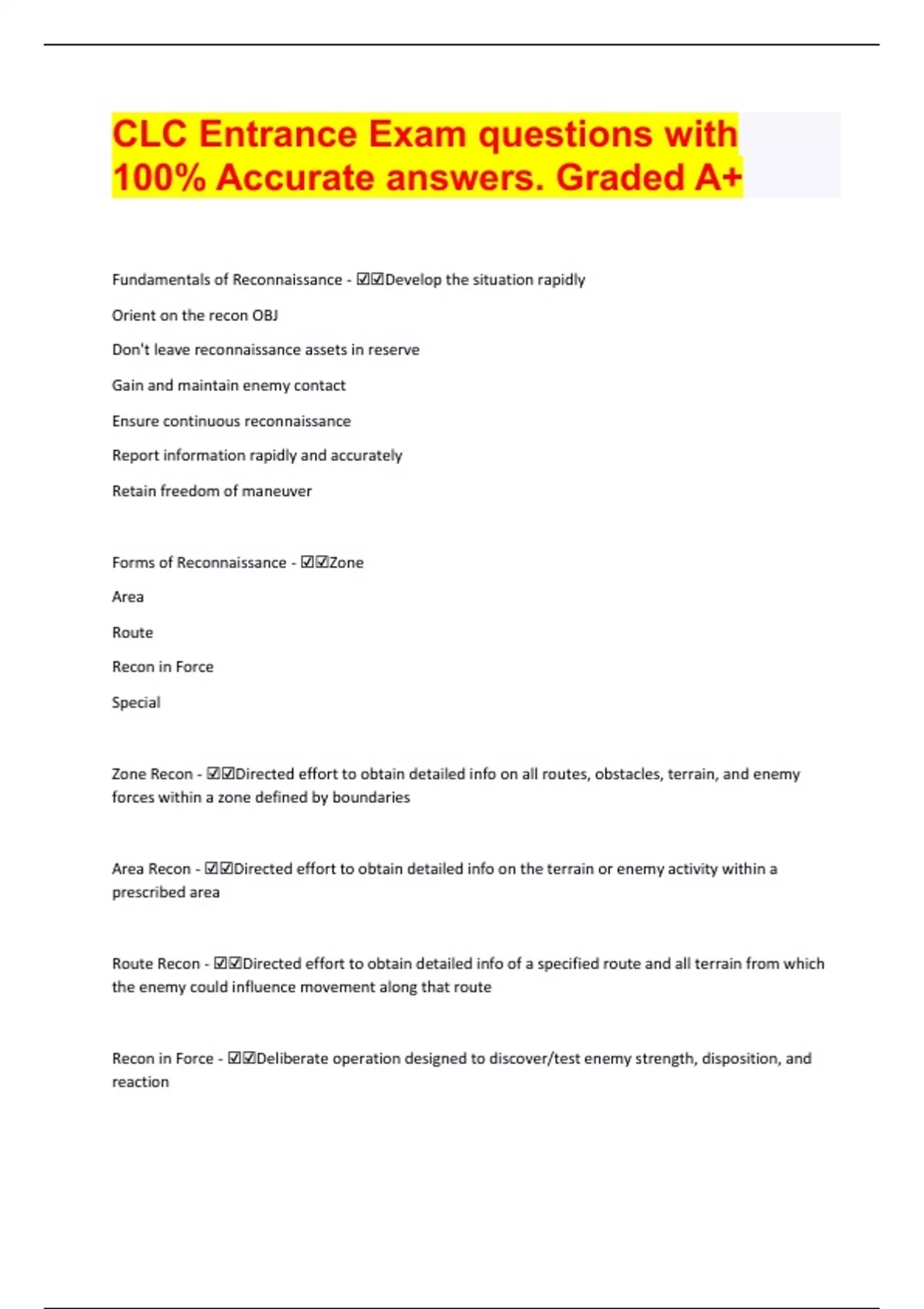 clc entrance exam questions with 100 accurate answers graded a document content and description below fundamentals of reconnaissance ☑☑develop the situation rapidly orient on the recon obj don
