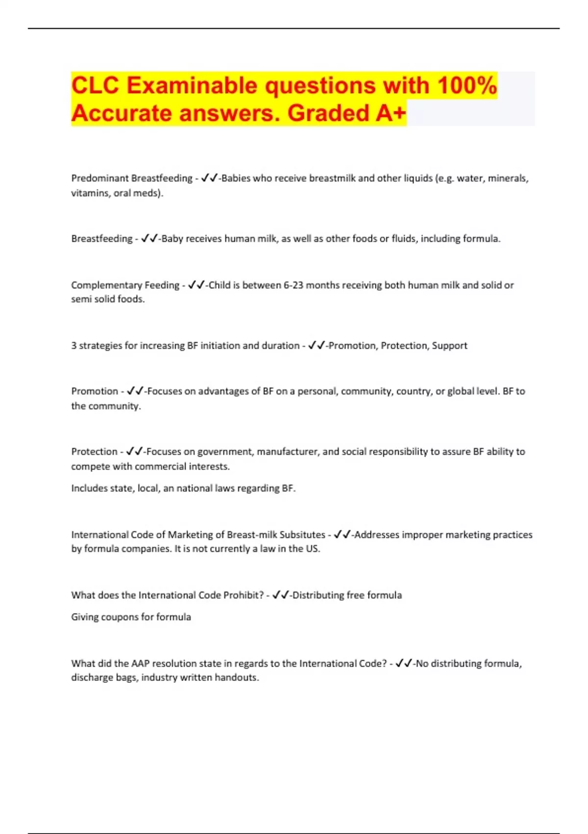 CLC Examinable questions with 100% Accurate answers. Graded A+ Document Content and Description Below Predominant Breastfeeding - -Babies who receive breastmilk and other liquids (e.g. water, minerals, vitamins, oral meds). Breastfeeding - -Baby receives human milk, as well as other foo ds or fluids, including formula. Complementary Feeding - -Child is between 6-23 months receiving both human milk and solid or semi solid foods. 3 strategies for increasing BF initiation and duration - -Promotion, Protection, Support Promotion - -Focuses on advantages of BF on a personal, community, country, or global level. BF to the community. Protection - -Focuses on government, manufacturer, and social responsibility to assure BF ability to compete with commercial interests. Includes state, local, an national laws regarding BF. International Code of Marketing of Breast-milk Subsitutes - -Addresses improper marketing practices by formula companies. It is not currently a law in the US. What does the International Code Prohibit? - -Distributing free formula Giving coupons for formula What did the AAP resolution state in regards to the International Code? - -No distributing formula, discharge bags, industry written handouts. Support - -Focuses on interaction of helpers with family, as well as program development and implementation. 10 steps to successful BF - -1. Written BF policy. Skin to Skin immediately after birth. 2. Train healthcare staff 3. Inform pregnant women about benefits and management of BF 4. Help all mothers initiate BF within 1 hour after birth 5. Show mother's how to BF and maintain lactation 6. Exclusive breast milk only 7. Practice rooming in 24 hours a day 8. Encourage BF on demand 9. No artificial teats or pacifiers 10. Establishment of BF support groups Healthcare staff responsibility for working with lactating mothers include what? - -1. Training 2. Minimum of 20 hours of training 3. 3 hours of competency verification What are the indications for providing supplementation other than breast milk? - -1. Medical condition 2. Parents request after being informed of consequences Protocol for calculating Baby's daily needs - -Baby's weight x 2.5 (2.7 or 3.0 if Baby needs to catch up weight) = daily ounces. PCP decides what the multiplier is!!! What should be assessed 3-5 days after birth by PCP? - -Hydration (elimination patterns) Body weight (no more than 7% loss) Observe Feeding Maternal or infant issues What is a CLC? - -Nationally recognized designation awarded by the ALPP. Practice parameters are designated by professional scope of practice. How many stools per day should a breast fed newborn have? - -4, some yellow by day 4. When should a baby be back to birth weight? - -12-14 days post birth How much weight should a baby gain daily? - -Approximately 1 ounce Why do women supplement with formula when there is no medical need? - -1. Lack of preparation for what the newborn period would be like. 2. Lack of timely interventions What period are women more at risk to stop BF? - -3-7 days post D/C. Alveoli - -Small glands in the breast that produce milk At-Breast Supplementer - -SNS system Atopy - -hypersensitive or allergic state involving an inherited predisposition What is the BFHI Baby Friendly Hospital Initiative - -Initiative by UNICEF and WHO (1991) to support breastfeeding in hospitals and maternity centers. "The 10 Steps". Unicef. Baby-Friendly Hospital Initiative. Available online: