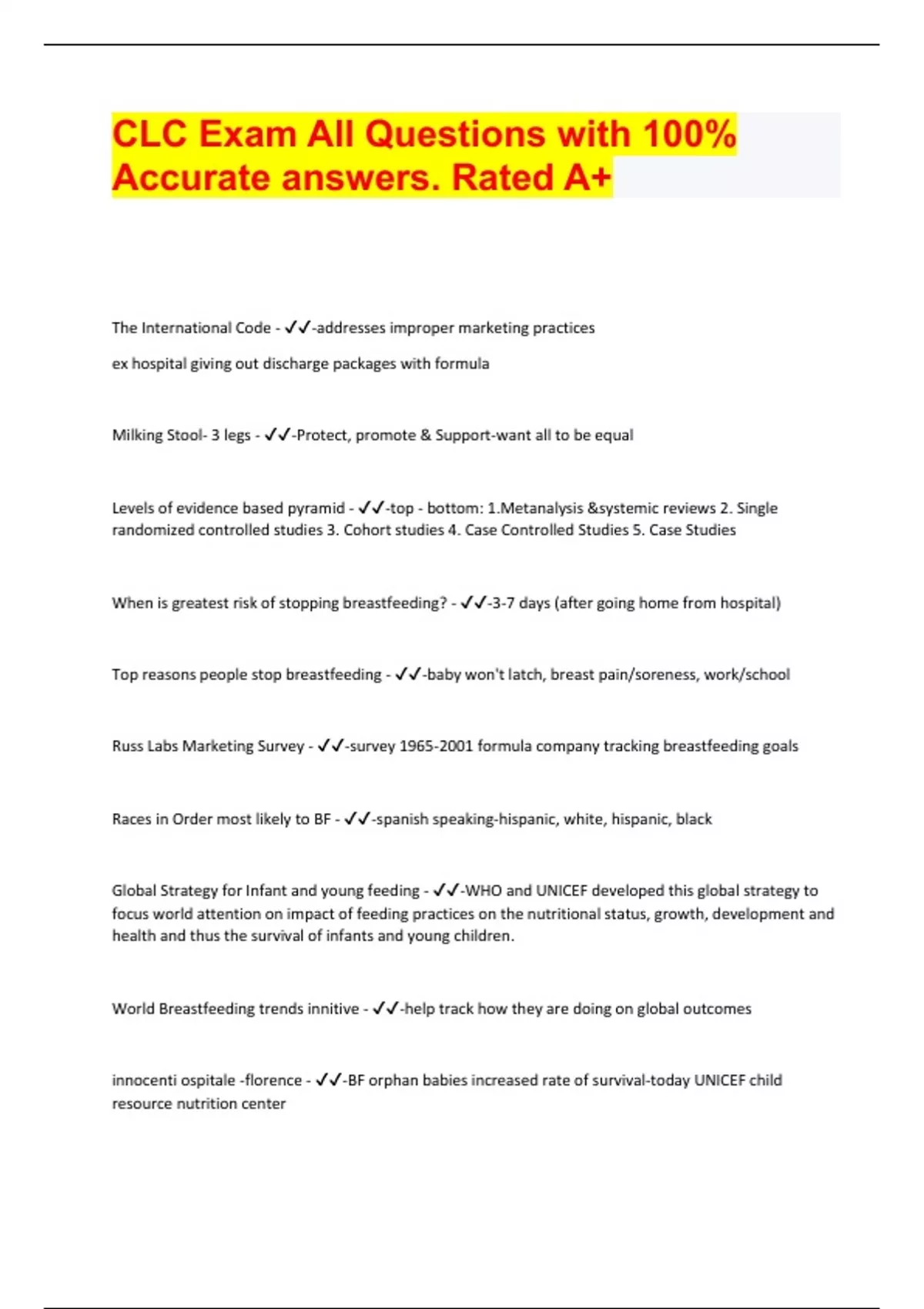 CLC Exam All Questions with 100% Accurate answers. Rated A+ Document Content and Description Below The International Code - -addresses improper marketing practices ex hospital giving out discharge packages with formula Milking Stool- 3 legs - -Protect, promote & Support-want all to be equal Levels of evidence based pyramid - -top - bottom: 1.Metanalysis &systemic reviews 2. Single randomized controlled studies 3. Cohort studies 4. Case Controlled Studies 5. Case Studies When is greatest risk of stopping breastfeeding? - -3-7 days (after going home from hospital) Top reasons people stop breastfeeding - -baby won't latch, breast pain/soreness, work/school Russ Labs Marketing Survey - -survey formula company tracking breastfeeding goals Races in Order most likely to BF - -spanish speaking-hispanic, white, hispanic, black Global Strategy for Infant and young feeding - -WHO and UNICEF developed this global strategy to focus world attention on impact of feeding practices on the nutritional status, growth, development and health and thus the survival of infants and young children. World Breastfeeding trends innitive - -help track how they are doing on global outcomes innocenti ospitale -florence - -BF orphan babies increased rate of survival-today UNICEF child resource nutrition center path of messages to make milk - -message to breast-to nervous system -to brain- to hormones to travel to breast- then to blood stream what cells make milk - -alveolar cells alveolar cells are what? what are they surrounded by - -layer of cells with milk inside, surrounded by myoepitheal cells Myoepitheal cells will contract when what hits them - -oxytocin Are the ducts in breast evenly spaced? - -No varies woman to woman How many nipple pores each breast? - -3-5 Milk is ____ &_____ from sebaceous gland - -antimicrobial and sticky what are the two major hormone of lactation? Where are they secreted from? - -oxytocin and prolactin, pituitary gland Prolactin is the hormone responsible for? - -Milk production What is the passage of prolactin being produced - -baby suckles- message to nervous system tells brain to secrete prolacin in blood- then tranverse into mother body into milk cells where milk is produced When doe humans have prolactin in them - -all the time (non pregnant, non lactating breast and nipples increase level of prolactin when touched) Prolactin levels go _____ in between nursing and _____ during nursing. - -down, rise _______ nursing leads to lower levels of prolactin and less rise with same amount of contact. - -infrequent If infants do no have frequent times at breast first few days prolactin will be _____ and sites will ____ be primed and receptor sites will start to ______ _______. - -low, not, start shutting down What is in receptor site during pregnancy? - -Progesterone When placenta leaves the body, the body responds by pushing ______ out of the receptor sites? - -progesterone When placenta is pushed out of body, progesterone leaves the receptor sites and they are open briefly, what goes inside to set site for lactation? - -Prolactin If prolactin is not set during first few hours after birth- - -there will be fewer sites and cause issues with milk supply Ongoing milk supply is associated with suckling within first ______ hours after birth - -2 For mothers with preemies initation of milk expression before _______ hours resulted in significantly more milk by day 7 - -one What hormone T3, T4, T5 - -Oxytocin When oxytocin hits myoepitheal cells what happens? - -They start retracting Oxytocin helps ducts to ______ in size and lumen to get ______ - -increase, smaller What triggers oxytocin? - -1. conditioned response (repeated stimuli over time) 2. Nipple Stretching (happens with proper latch- oxytocin levels goes up and down with suck and swallow) 3. baby hand massage (has to do with T3 and T5) each hand movement releases oxytocin Where is oxytocin and prolactin excreted? - -pituitary gland ______ is excreted from posterior pituitary? - -Oxytocin ______ is excreted from anterior pituitary? - -Prolactin Prolactin is produced mainly by nipple ______, by presence of baby stimulation T ____ & T____ - -stimulation, 4 and 5 ________ hormone is affected by stress and ______ hormone is not affected by stress - -oxytocin (extreme situation, will stop flowing), prolactin Milk is species ______. - -Specific Mammal species with high fat/protein and low water content have ______ feeds. - -infrequent Lactose is essential for milk production because it provides the driving ______ force behind the formation of milk. - -osmotic Human milk has the highest _______ of all mammal milk. - -lactose human milk is ideal for ______ growth - -brain Lactogensis stage 1 is secretory differentiation and production of _______ under influence of _______ hormones. When placenta is delivered _________ hormones is gone and _____ goes into receptor sites. Then we go to ________. - -colustrum, placental, progesterone, prolactin lactogensis stage 2 Lactogensis stage 2- rapid decrease in _______ and now ______ is in cells. The colustrum will change over to ______ milk and colustrum will go ______. - -progesterone, prolactin, mature, down Lactogensis stage 3 is also called ( has two other names) - -lactation or galactopoesis Lactogensis stage 3 has _____ from frequent nipple stimulation, there is ______removal of milk and long term production of ______ - -prolactin, frequent, milk As prolactin goes into receptor sites and makes milk the ______ disappear - -spaces Preterm milk appears to have higher ______, _______ and _____ than term milk (sga, lga does not matter) - -protein, fat and electrolytes Breastmilk changes after 6 months it is more _____, fat _____ and after a year fat _________ and energy content ______ - -dense, increases, increases, increases does it matter if it is foremilk, hindmilk - -no think of kalahari desert nurse for 2.5 min at a time Breastmilk composition ______ during a feed. - -changes when doing before and after