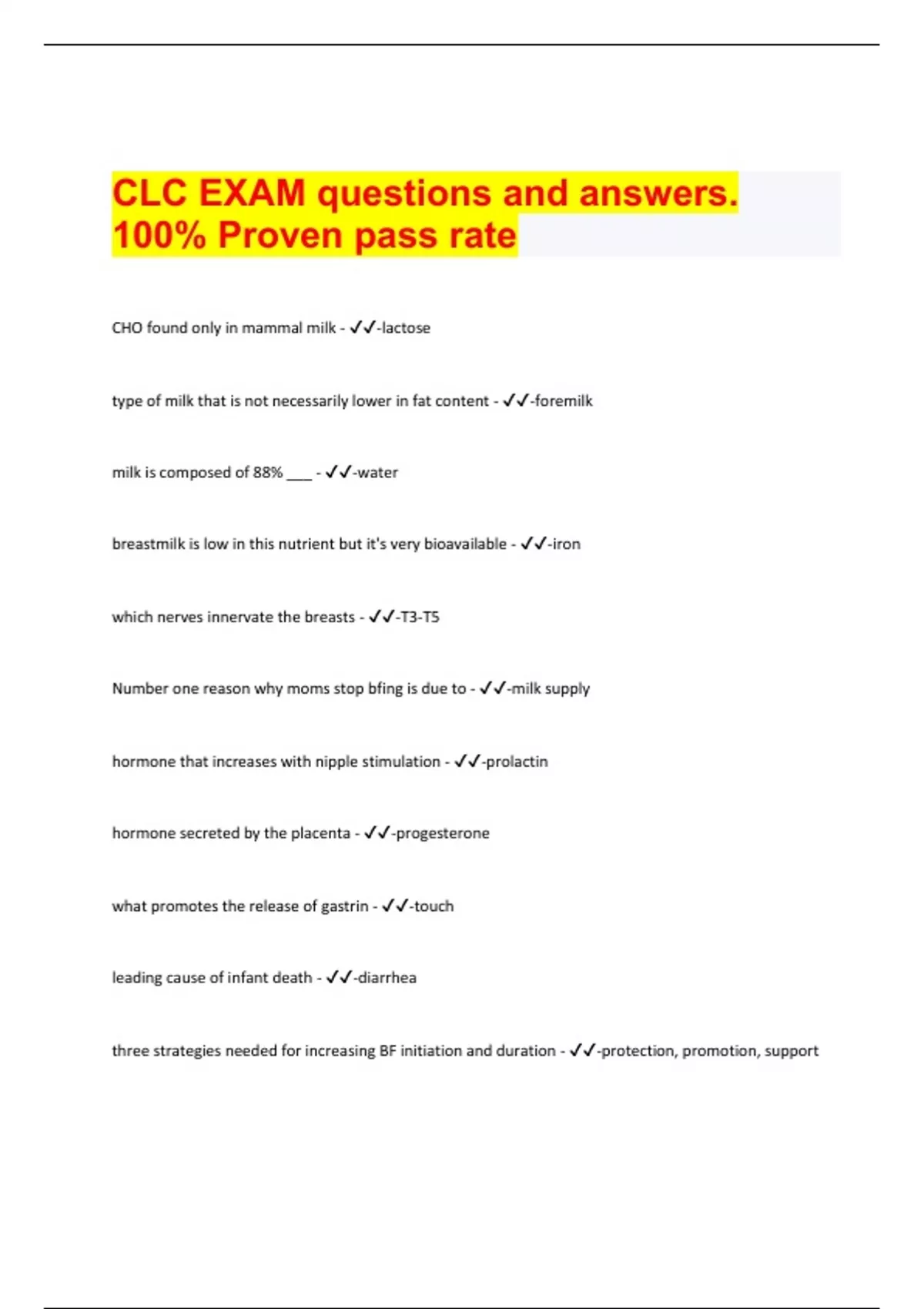 CLC EXAM questions and answers. 100% Proven pass rate Document Content and Description Below CHO found only in mammal milk - -lactose type of milk that is not necessarily lower in fat content - -foremilk milk is composed of 88% ___ - -water breastmilk is low in this nutrient but it's very bioavailable - -iron which nerves innervate the breasts - -T3-T5 Number one reason why moms stop bfing is due to - -milk supply hormone that increases with nipple stimulation - -prolactin hormone secreted by the placenta - -progesterone what promotes the release of gastrin - -touch leading cause of infant death - -diarrhea three strategies needed for increasing BF initiation and duration - -protection, promotion, support