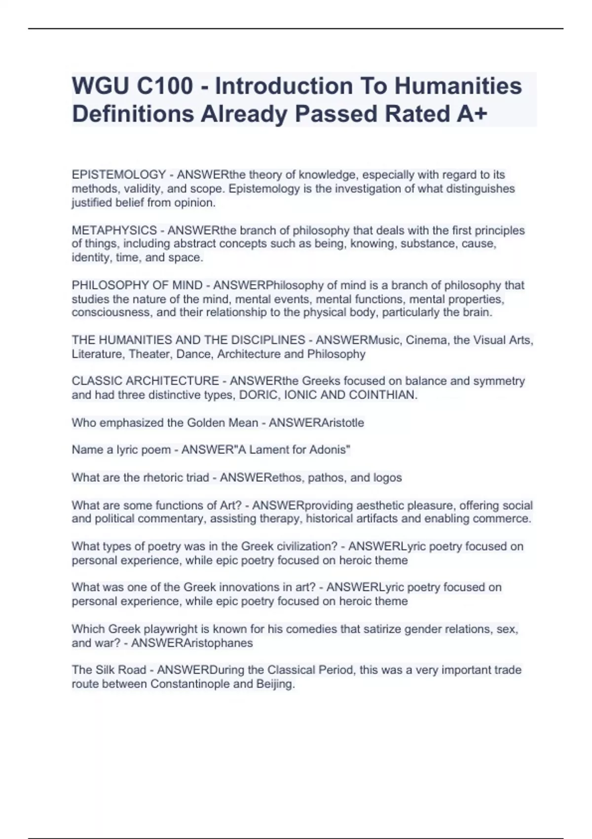 wgu c100 introduction to humanities definitions already passed rated a