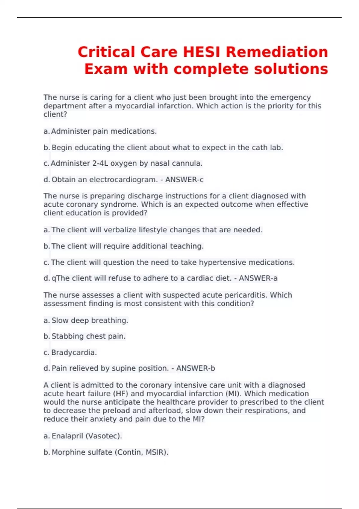 The nurse is caring for a client who just been brought into the emergency department after a myocardial infarction. Which action is the priority for this client? a. Administer pain medications. b. Begin educating the client about what to expect in the cath lab. c. Administer 2-4L oxygen by nasal cannula. d. Obtain an electrocardiogram. - ANSWER-c The nurse is preparing discharge instructions for a client diagnosed with acute coronary syndrome. Which is an expected outcome when effective client education is provided? a. The client will verbalize lifestyle changes that are needed. b. The client will require additional teaching. c. The client will question the need to take hypertensive medications. d. qThe client will refuse to adhere to a cardiac diet. - ANSWER-a The nurse assesses a client with suspected acute pericarditis. Which assessment finding is most consistent with this condition? a. Slow deep breathing. b. Stabbing chest pain. c. Bradycardia. d. Pain relieved by supine position. - ANSWER-b A client is admitted to the coronary intensive care unit with a diagnosed acute heart failure (HF) and myocardial infarction (MI). Which medication would the nurse anticipate the healthcare provider to prescribed to the client to decrease the preload and afterload, slow down their respirations, and reduce their anxiety and pain due to the MI? a. Enalapril (Vasotec). b. Morphine sulfate (Contin, MSIR). c. Hydrochlorothiazide (HCTZ, Urozide). d. Diazepam (Valium, Diastat, Diazemuls). - ANSWER-b