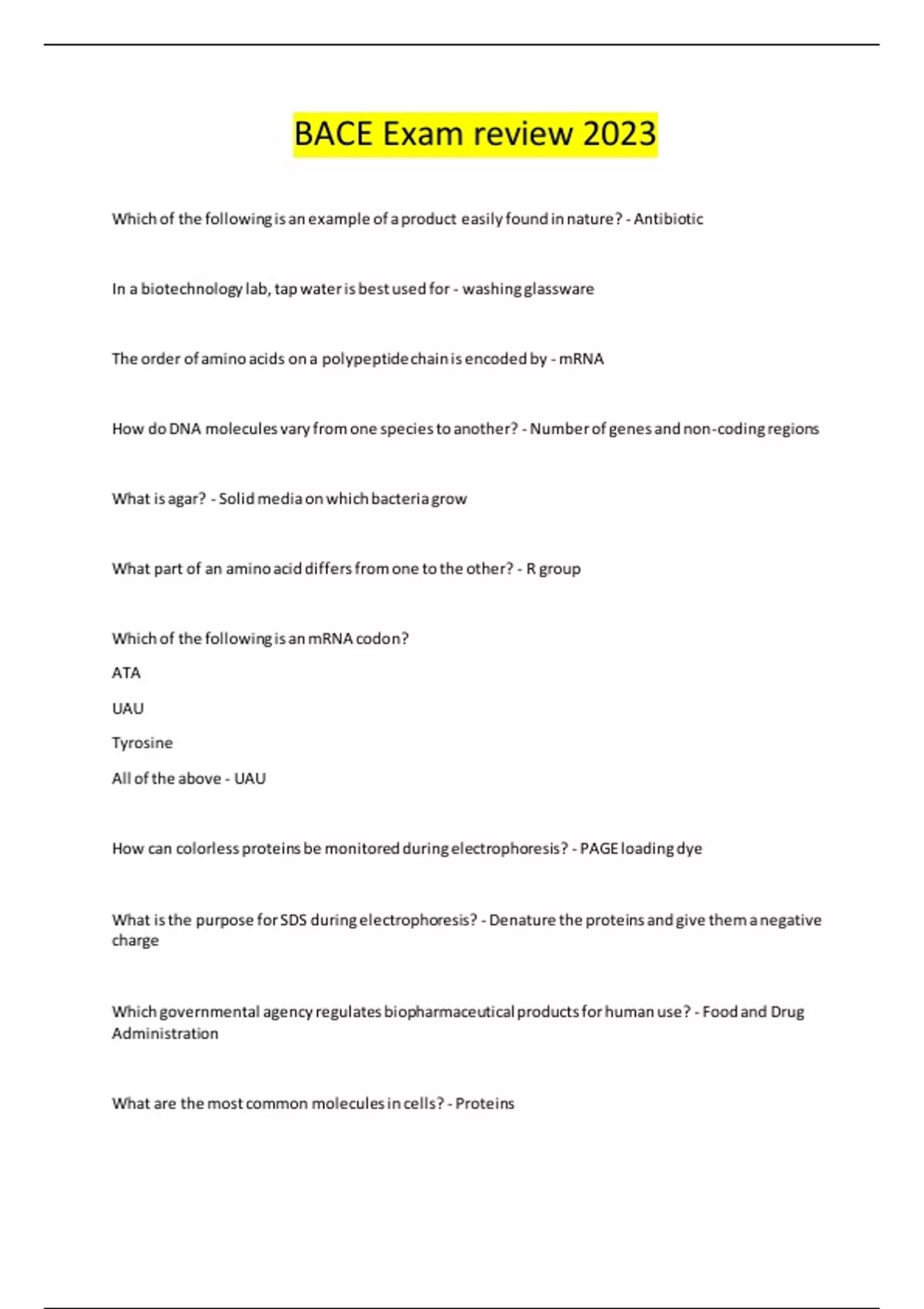 Which of the following is an example of a product easily found in nature? - Antibiotic In a biotechnology lab, tap water is best used for - washing glassware The order of amino acids on a polypeptide chain is encoded by - mRNA How do DNA molecules vary from one species to another? - Number of genes and non-coding regions What is agar? - Solid media on which bacteria grow What part of an amino acid differs from one to the other? - R group Which of the following is an mRNA codon? ATA UAU Tyrosine All of the above - UAU How can colorless proteins be monitored during electrophoresis? - PAGE loading dye What is the purpose for SDS during electrophoresis? - Denature the proteins and give them a negative charge Which governmental agency regulates biopharmaceutical products for human use? - Food and Drug Administration What are the most common molecules in cells? - Proteins Glucose is a - Monosaccharide Where does translation occur in prokaryotes? - At the ribosomes The process of making RNA from DNA is called - Transcription The process by which RNA is decoded and polypeptides are formed: - Translation Autonomously replicating small circles of DNA present in some bacteria - Plasmids Modifications of DNA in an organism is called - Genetic Engineering Parkinson's, diabetes, and cystic fibrosis (CF) are examples of - Genetic Disorders Organism that does not have nucleus or membrane bound organelle, so DNA is contained in cytoplasm - Prokaryotes Helps researchers measure amount of protein present - Concentration assays Determines the amount and length of activity for a given enzyme or drug in a test organism - Potency assays Test that show if a specific enzyme or drug is present and conducting the expected reaction - Activity assays Tests used for understanding the relationship between dosage and activity of a given pharmaceutical drug - PK/PD assays